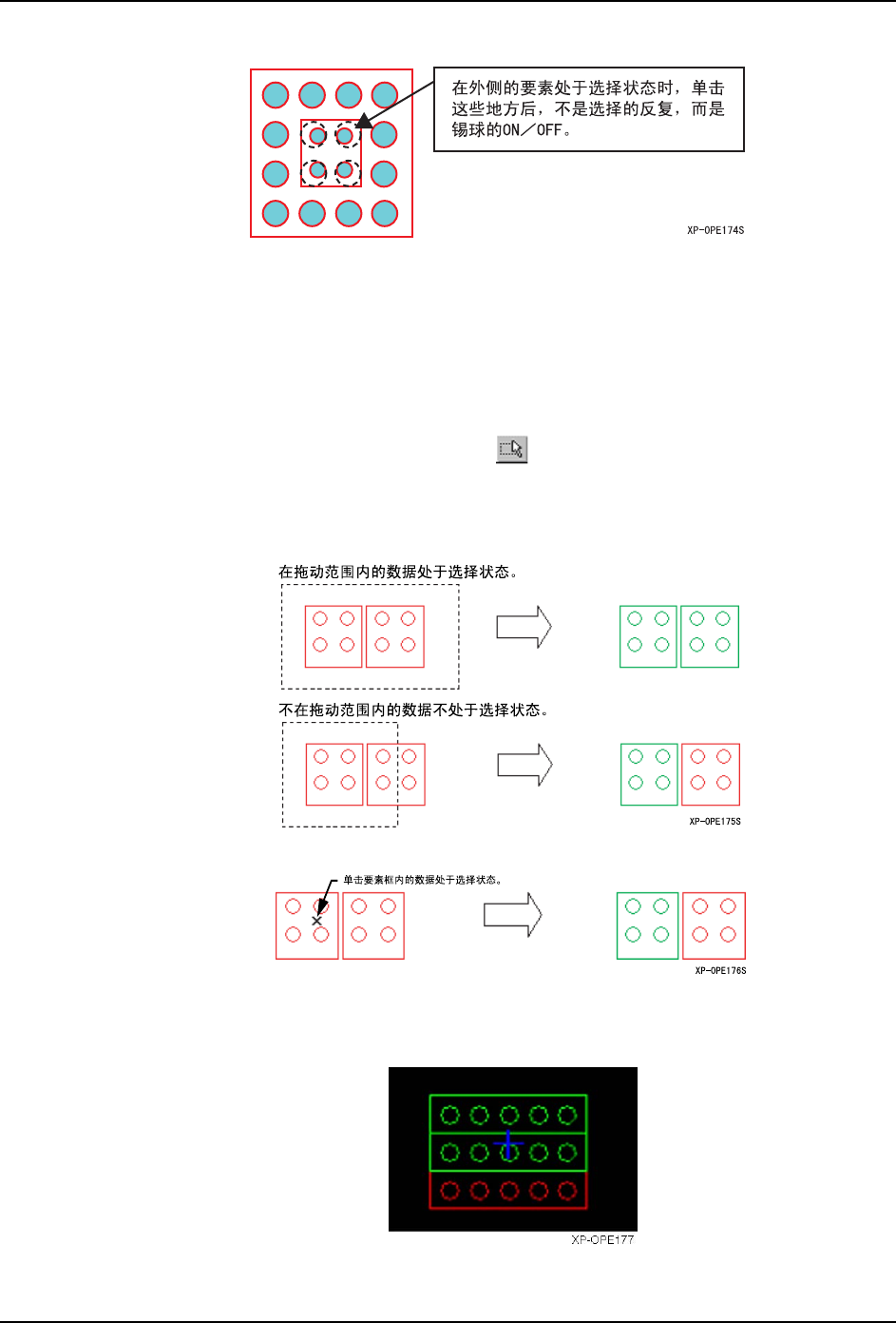 备注 ) 在此模式上不显示移动用的手柄。请在选择状态下拖动或者在 [ 锡球要素 ] 对话框的 [X 位置,