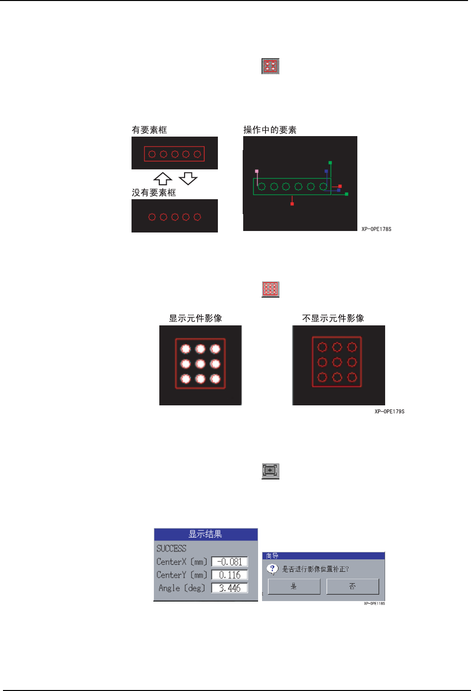 SYS-XP243-1.0S 5.MDW/PDW XP-242E/243E 系统手册 349 要素框的显示 / 非显示 按下下图,切换要素框的显示。 当前操作中的要素以现状用操作 手柄和附加框显示。 元件影像的非显示 仅仅在按下下图期间,删除编辑 中的元件影像的显示。 影像处理 1. 按下下图,进行影像位置补正。 使用作成的要素进行影像识别, 显示出是否进行中心点补正的询问信 息。 。 选择 「是」时,补正影像中心。 选择 「否」时,结…