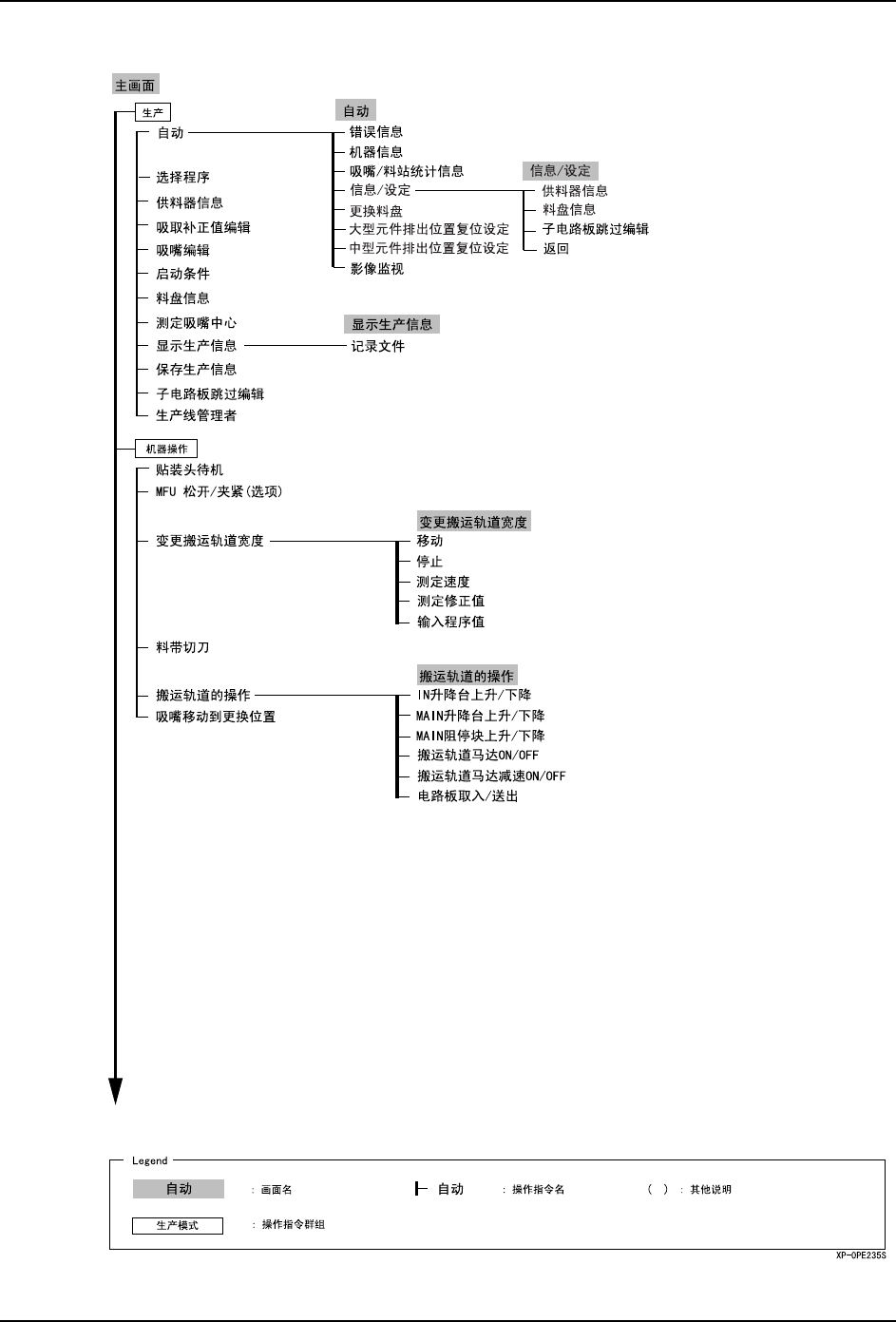 SYS-XP243-1.0S 6. 操作指令 XP-242E/243E 系统手册 351 6. 操作指令 6.1 操作指令阶层 在本章中, 用指令阶层树形图来说明机器上的所有的指令及 其体系。 通过参考指令阶层树形 图,能够很容易地理解在指令操 作时,机器上表示的全部指令的概要 。 · 机器的触摸屏中 的各画面上显示出数个指 令。在 指令阶层树形图中这 些指令看作 为是一个指令群,被归纳在分支 ( 纵向粗线 ) 的下面。 · 在指令阶层…
