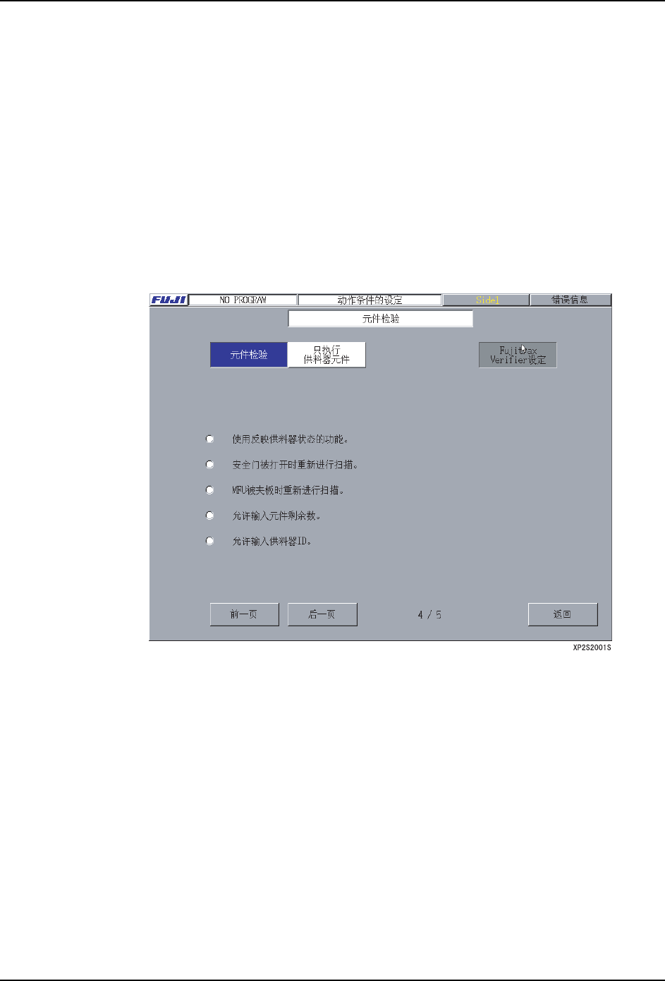 SYS-XP243-1.0S 3. 操作系统 XP-242E/243E 系统手册 37 其他的动作条件设定 按照以下的步骤,进行其他的动 作条件的设定。 操作步骤 1. 在 [ 主画 面 ] 上选择 [ 维修保养 A]、 [ 动作条件设定 ], 显示 出 [ 动作条件设 定 ] 画面。 2. 不使用元件检验时,按下 [ 后一页 ] 按键,显示出 「其他」页。 3. 按下 「电路板真空」旁边的按键,设定 是否使用电路板真空。默认值为 「不…