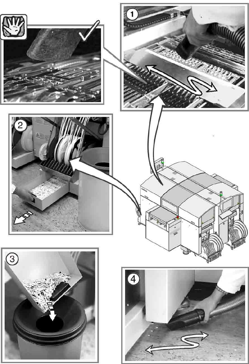 ④ 用吸尘器清洁废料带容器四周,然后将其推回到料车中。