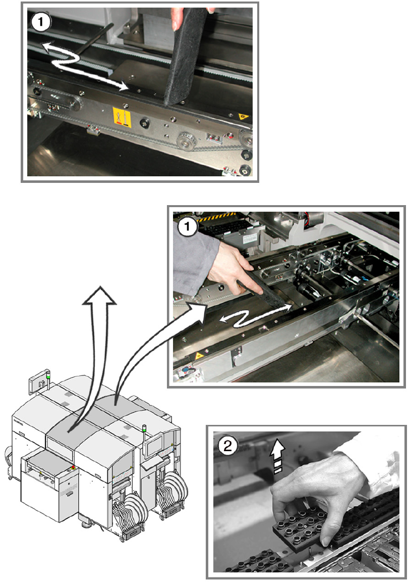 ① 使用吸尘器仔细清洁供料器区域。供料器区域中不应有松散元件。