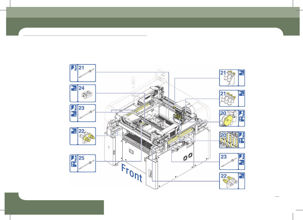 SM411F Maintenance Handbook 24 Chap ter 3 Adva nced Fl exible Compon ent P lacer 일 일 점 검 추천세정액, 에 어건, 노즐용 윤활유, 분사용 스트로, 내경 관통용 핀, 공기 분사기, 세척액 노즐의 막힘 및 깨짐으로 인 한 PCB 불량을 방지 1. “Fr ont X Fr mae의 전면이동 (P age 9 )”과 “R ear X F…