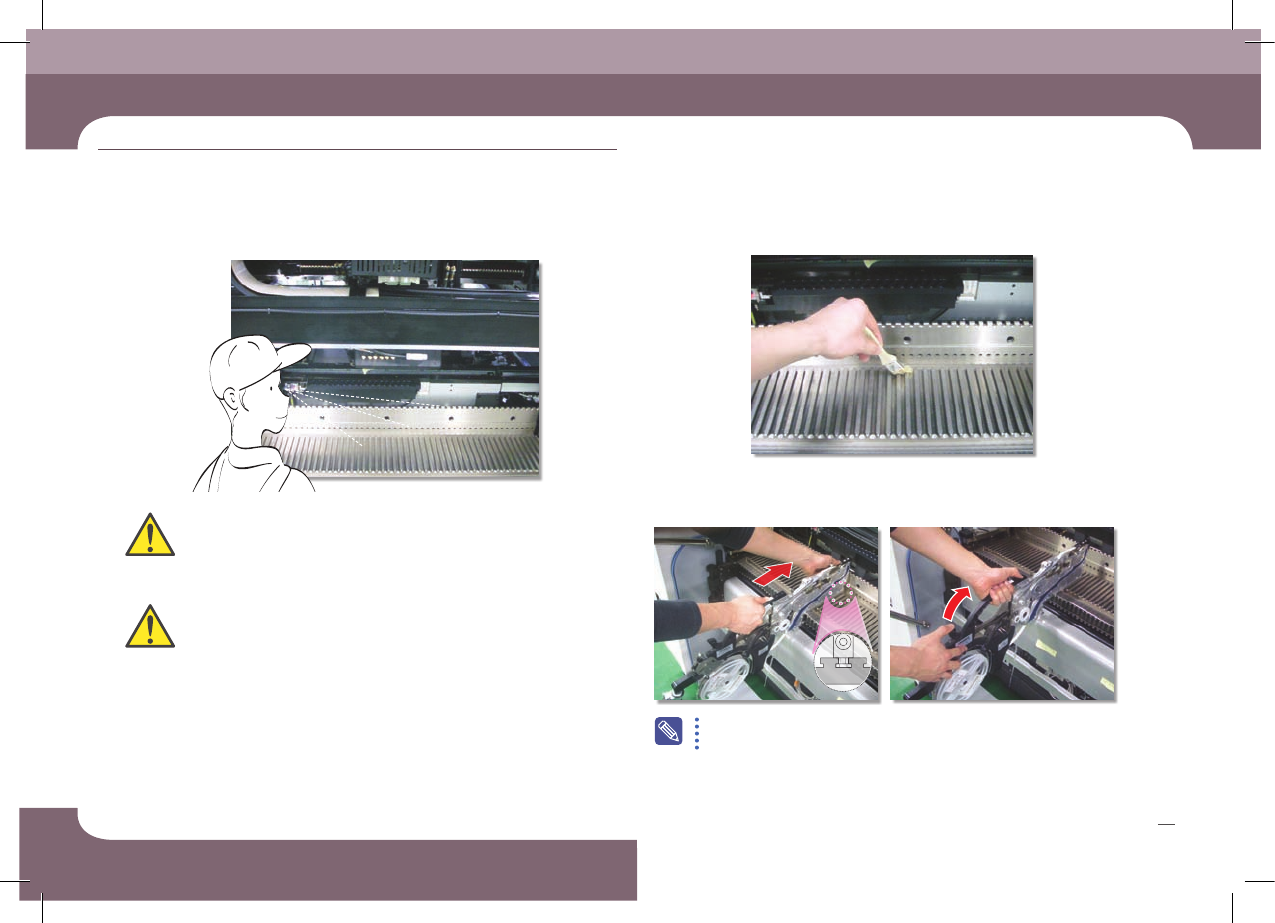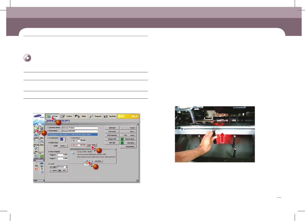 SM411F Maintenance Handbook 30 Chap ter 3 Adva nced Fl exible Compon ent P lacer 1 2 3 4 일 일 점 검 극세사 천, 세 척액 솔더 등의 이 물질이 장비 내 부로 들어가면 고 장의 원인이 됨 으로 이를 방지 할 수 있음 1. MMI 의 Bo ar d 정보를 선택하 고, Boar d Si ze Y 값에 ‘250’ 입력하 고 C…