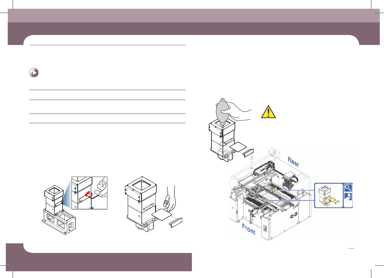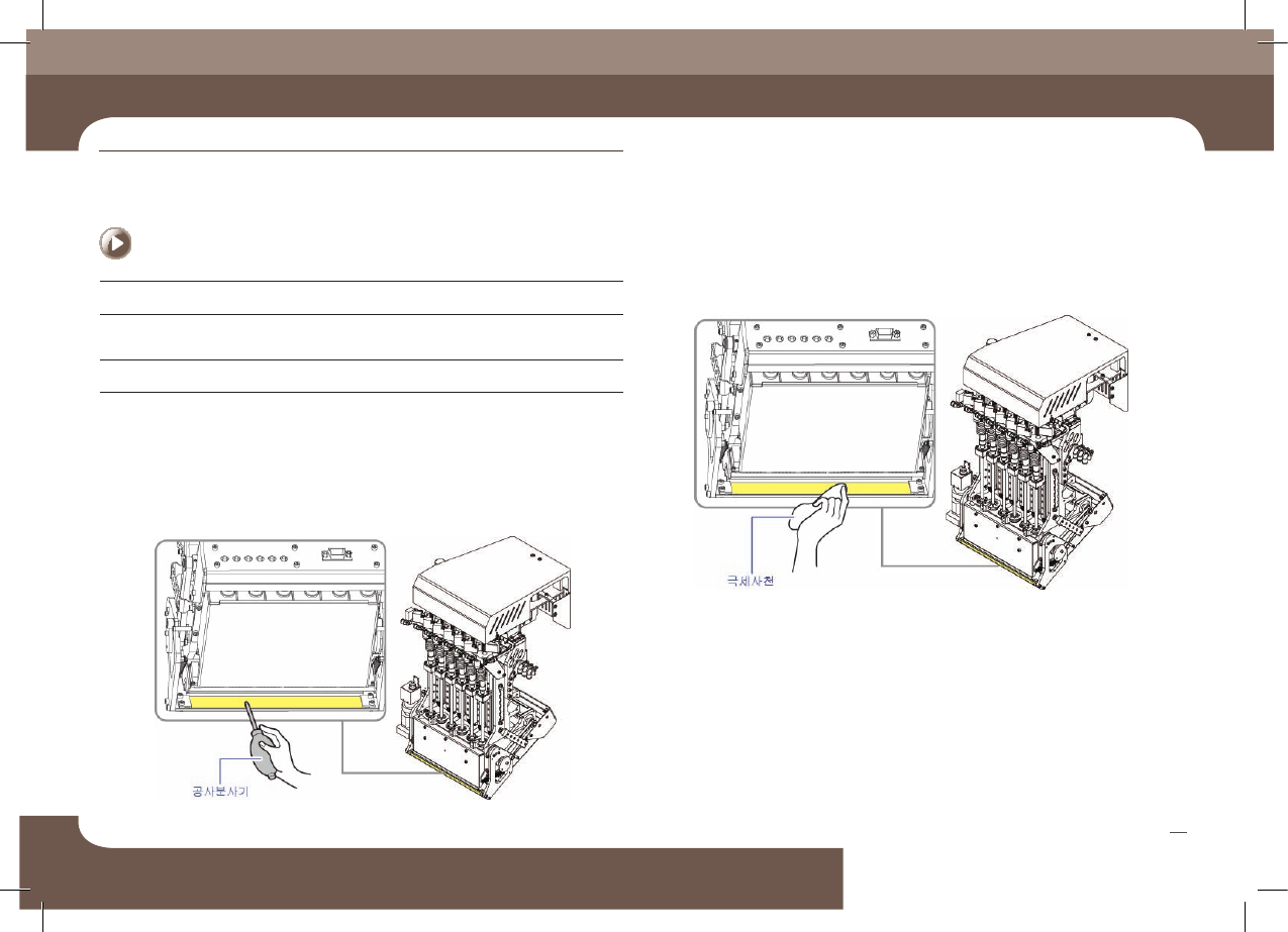 SM411F Maintenance Handbook 38 Chap ter 4 Adva nced Fl exible Compon ent P lacer 주 간 점 검 공기분사기, 알 코올, 면봉, 렌치 1. “Fr ont X Frmae 의 전면 이동 (Page 9)” 과 “ R ea r X Fr am e의 후면이동 (Pa ge 1 2)” 을 참조하 여 각각 의 X F r am e을 양쪽 끝으 로 이…