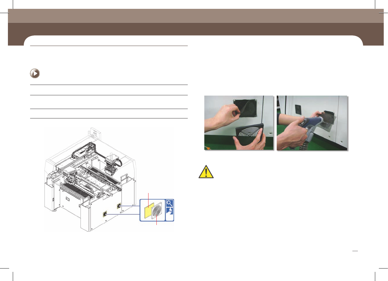 Chapte r 4 주 간 점검 SM411F Maintenance Handbook 39 Chap ter 4 Adva nced Fl exible Compon ent P lacer 주 간 점 검 공기분사기, 알 코올, 극세사 천 1. “Fr ont X Fr mae의 전면이동 (P age 9 )”과 “R ear X F ram e의 후면 이동 (Pa ge 12)”을 참조하 여 각 각의 X Fra m…