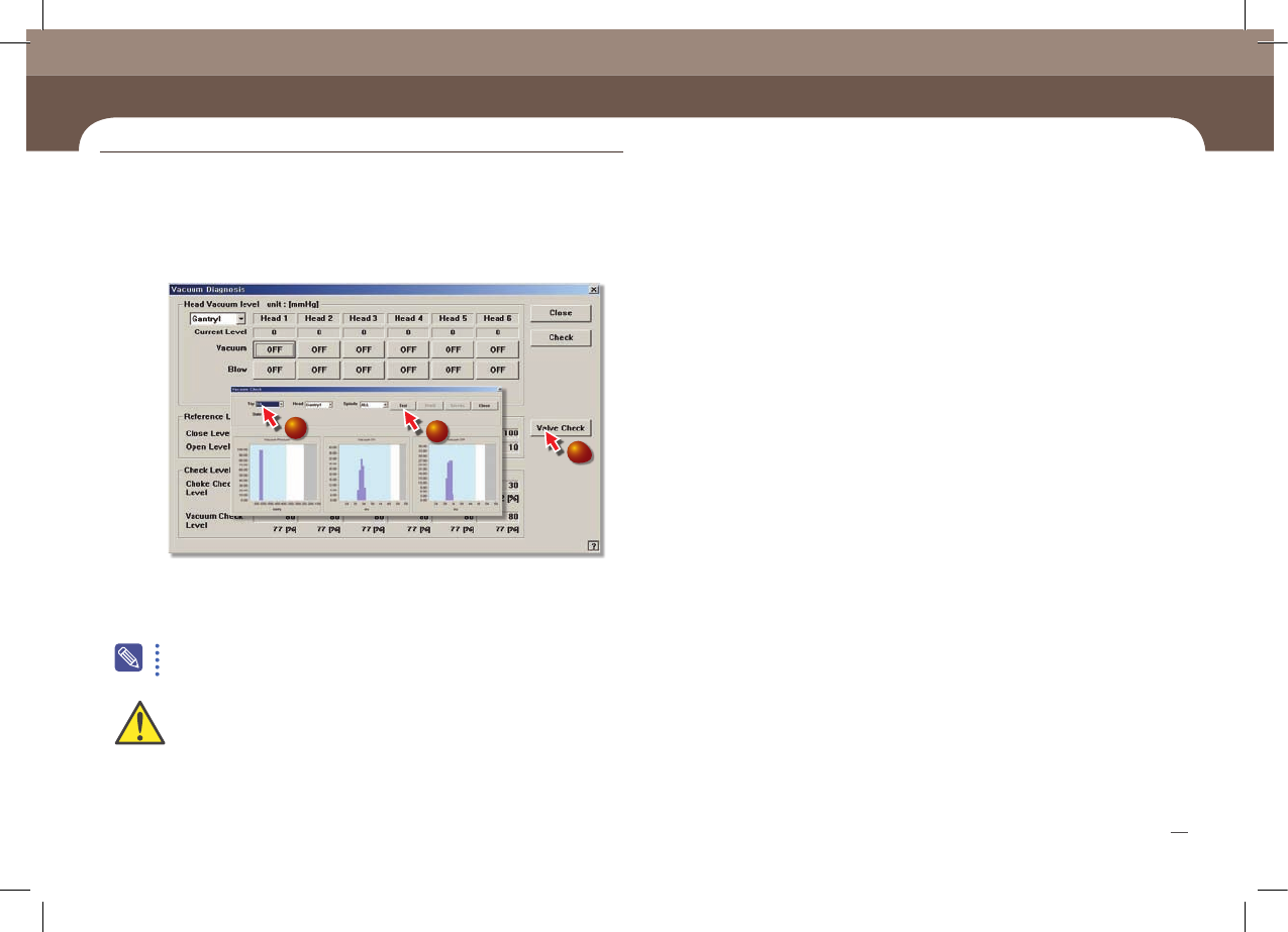 SM411F Maintenance Handbook 42 Chap ter 4 Adva nced Fl exible Compon ent P lacer 3 5 4 주 간 점 검 4. <V alve Chec k> 버 튼을 클릭하고, ‘V alv e Che ck ’대화 상자의 < T ry> 콤보 박스에서 V ac uum ON/ OFF 횟 수를 선택한 후 < T est >…