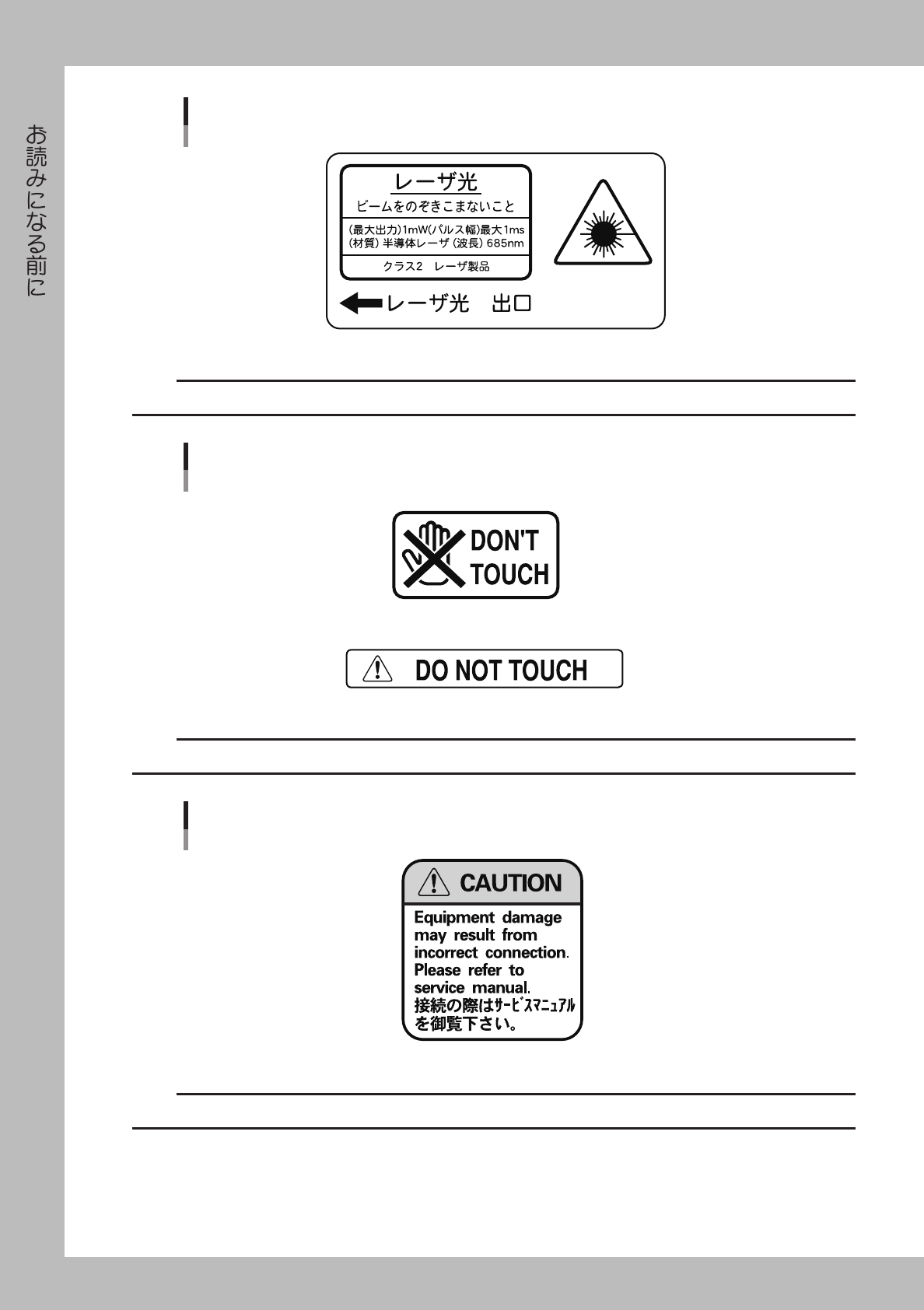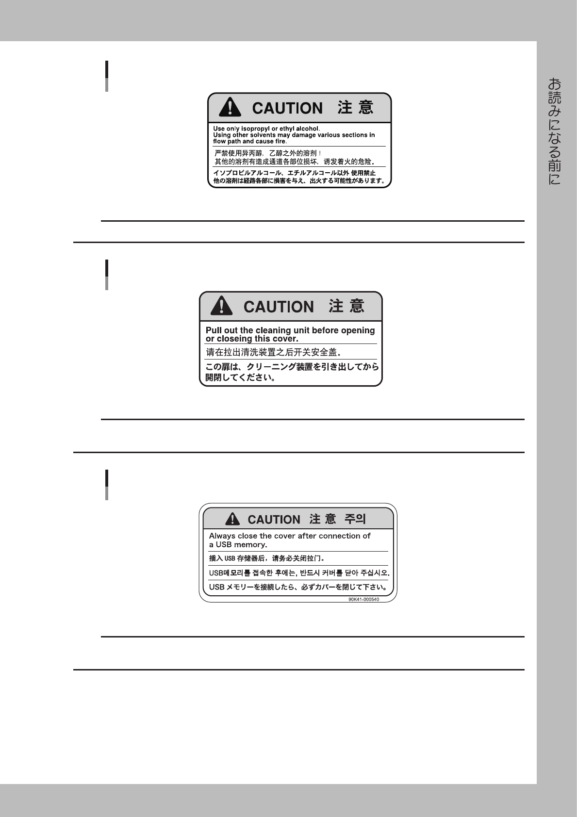 ix 指定外の溶剤は使わない 22 0 01 - G0 -2 L c 注意 指定外の溶剤を使用すると、機械へのダメージおよび出火の原因となりますので注意してください。 扉の開閉に注意 22 0 01 - G0 -2 R c 注意 このラベルの付いた扉を開閉するときは、先にクリーニング装置を引き出してください。逆にすると、扉が損傷する恐れがあり ます。 カバーを閉じて作業する 22 0 01 - G0 -0 T c 注意 FDD や…