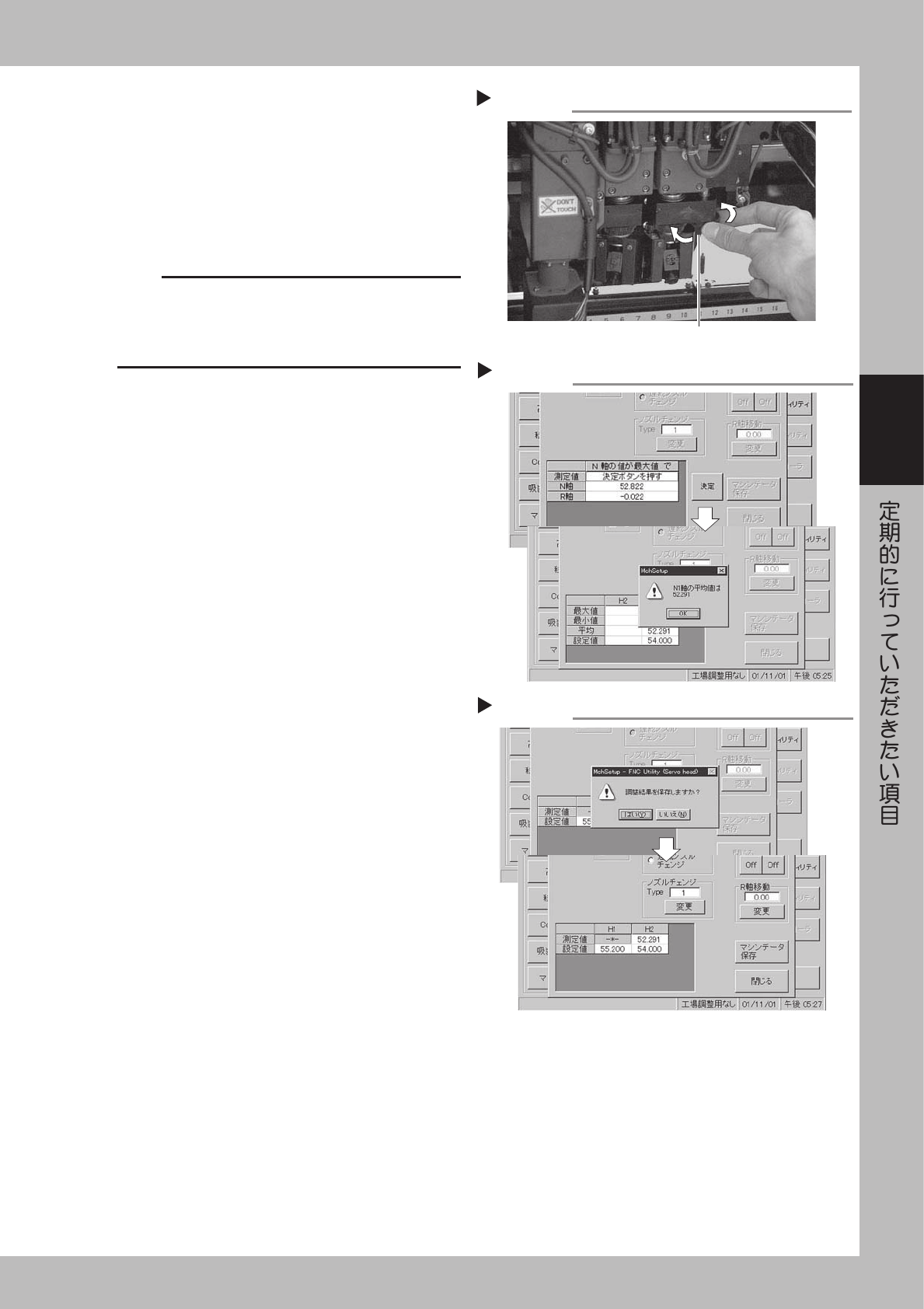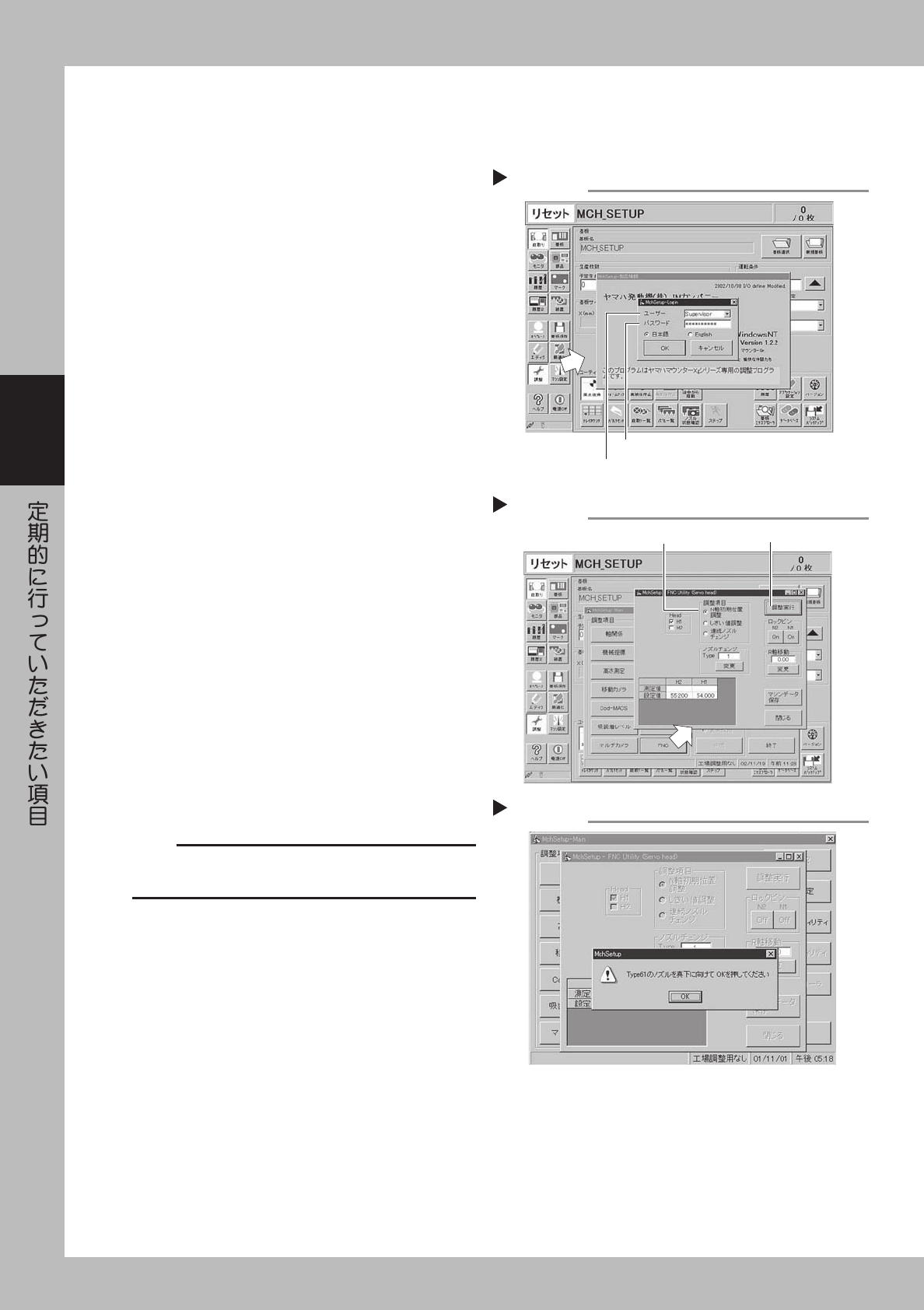 3-12 3 2 . 1 . 4 清 掃 後 の N 軸 初 期 位 置 調 整 ノ ズ ル ブ ロ ッ ク の 取 り 外 し お よ び 取 り 付 け を 行 っ た 場 合 は 、 N 軸 の 初 期 位 置 調 整 が 必 要 に な り ま す 。 1 基 板 デ ー タ を 選 択 し ま す 。 調 整 を は じ め る 前 に 調 整 用 基 板 デ ー タ の 「 M C H - S E T U P 」 を 選…