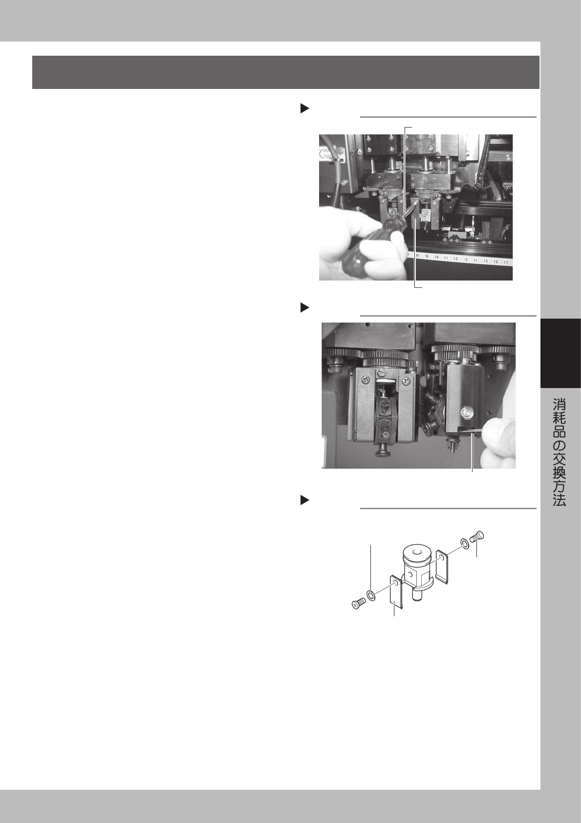 第 4 章 消耗品の交換方法 目次 1 . ノ ズ ル 板 バ ネ の 交 換 4 - 1 2 . エ ア ジ ョ イ ン ト の 交 換 4 - 2 3 . エ ジ ェ ク タ ー バ ル ブ の 交 換 4 - 3 4 . フ ィ ー ダ ー バ ル ブ の 交 換 4 - 4 5 . 基 板 搬 送 部 の 清 掃 と ベ ル ト 交 換 4 - 5 6 . …