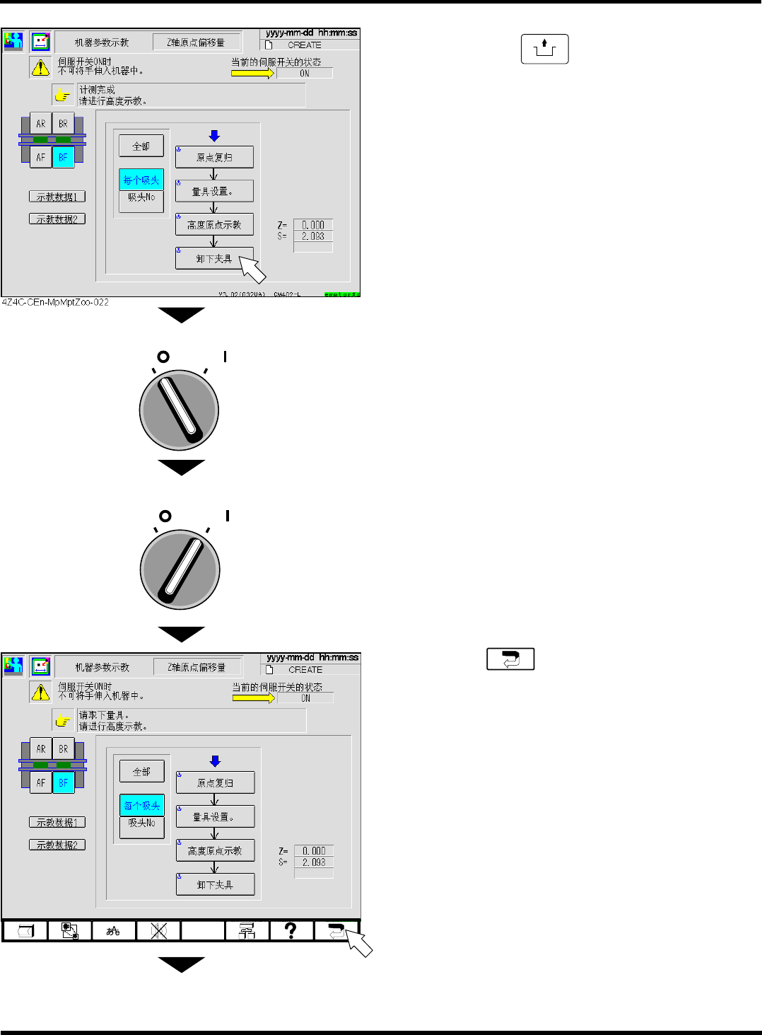 CM402 维修手册 2.2 机器参 数的示教步骤 Page 2-40 14. 按操作面板的 UNLOCK + [ 卸下夹具 ] 。 15. 将伺服开关置于 OF F 状态。 16. 打开安全盖 17. 取下吸嘴。 18. 关闭安全盖。 19. 将伺服开关置于 ON 状态。 ∗ 重复步骤 2. ~ 19. 的 操作, 在其它工作台 上也要 进行同样的操作 。 20. 按功能键 。 下一页 OFF ( ) ON ( ) S E RVO 4…