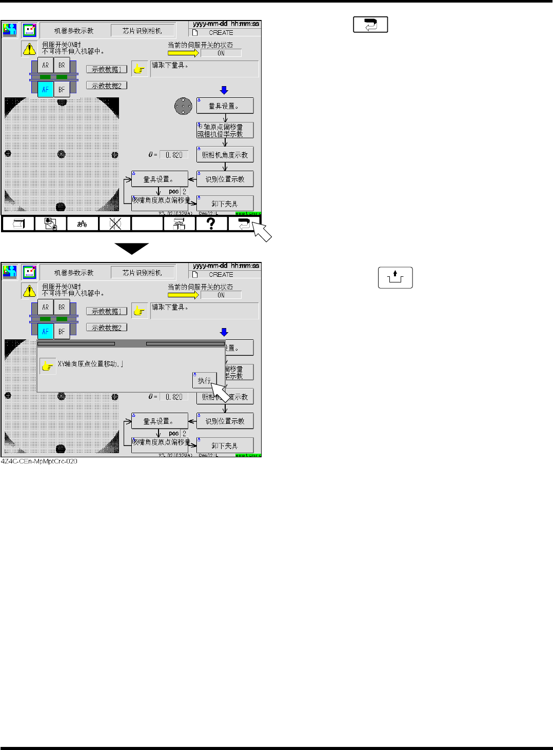 CM402 维修手册 2.2 机器参 数的示教步骤 Page 2-49 2.2. 4 宽度调整轴的原点偏移量 宽度调整轴的原点偏移量 宽度调整轴的原点偏移量 宽度调整轴的原点偏移量 使用工具 游标 需要时间 2 分钟 前期准备 请将支撑销全部 取下。 1. 按 [ 宽度调整轴原点偏移量 ] 键。 2. 选择示教工作台。 3. 按操作面板的 UNLOCK + [ 原点复归 ] 键。 • 宽度调整轴将复 归到原点位置 上。 4. 按操作…