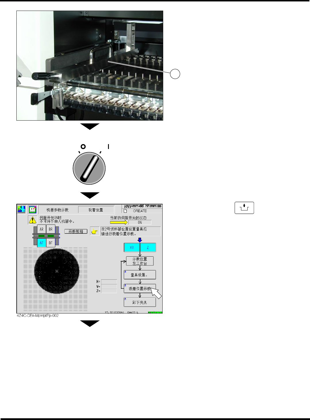 CM402 维修手册 2.2 机器参数的 示教步骤 Page 2-62 2. 2.2. 7 吸着位置 吸着位置 吸着位置 吸着位置 使用工具 吸着位置量具 需要时间 3 分钟 前期准备 ∗ 在进行吸着位置 示教前,请确 认偏振 光板没 有安装 在吸 头照相机 上 。 1. 按 [ 吸着位置 ] 键。 2. 选择示教工作台。 • 此时, 请确认是否已选择好 ‘X Y ’ 和 ‘Z’( 反转表示 ) 工作台。 3. 确认是否处于 ‘ 左…
