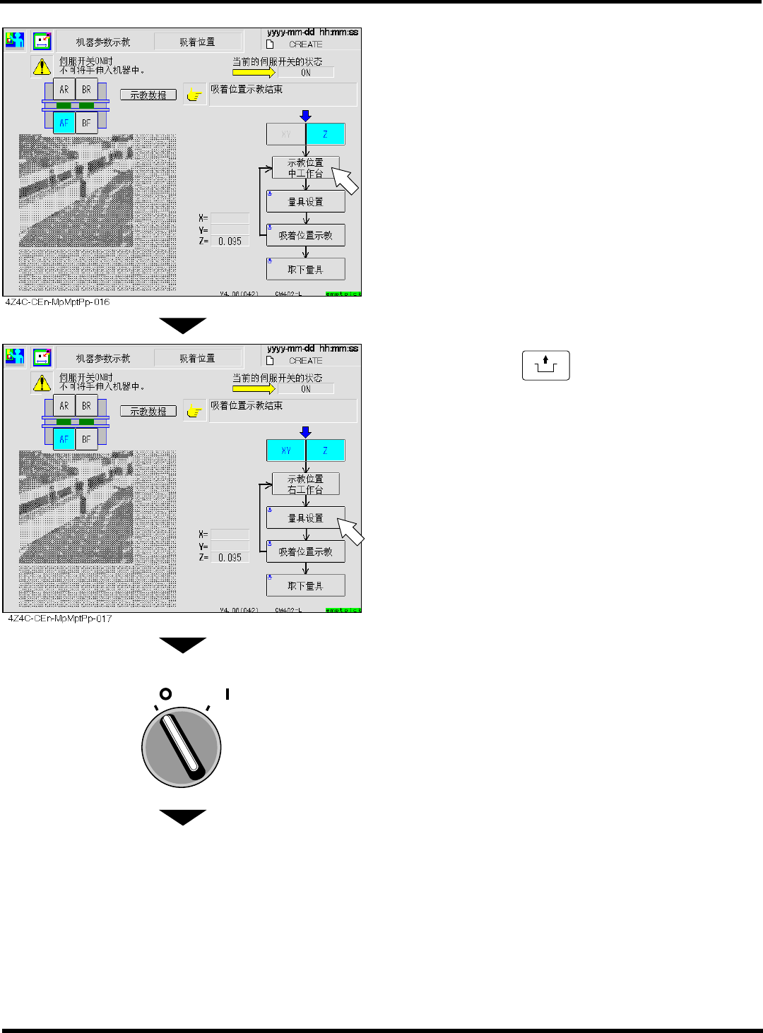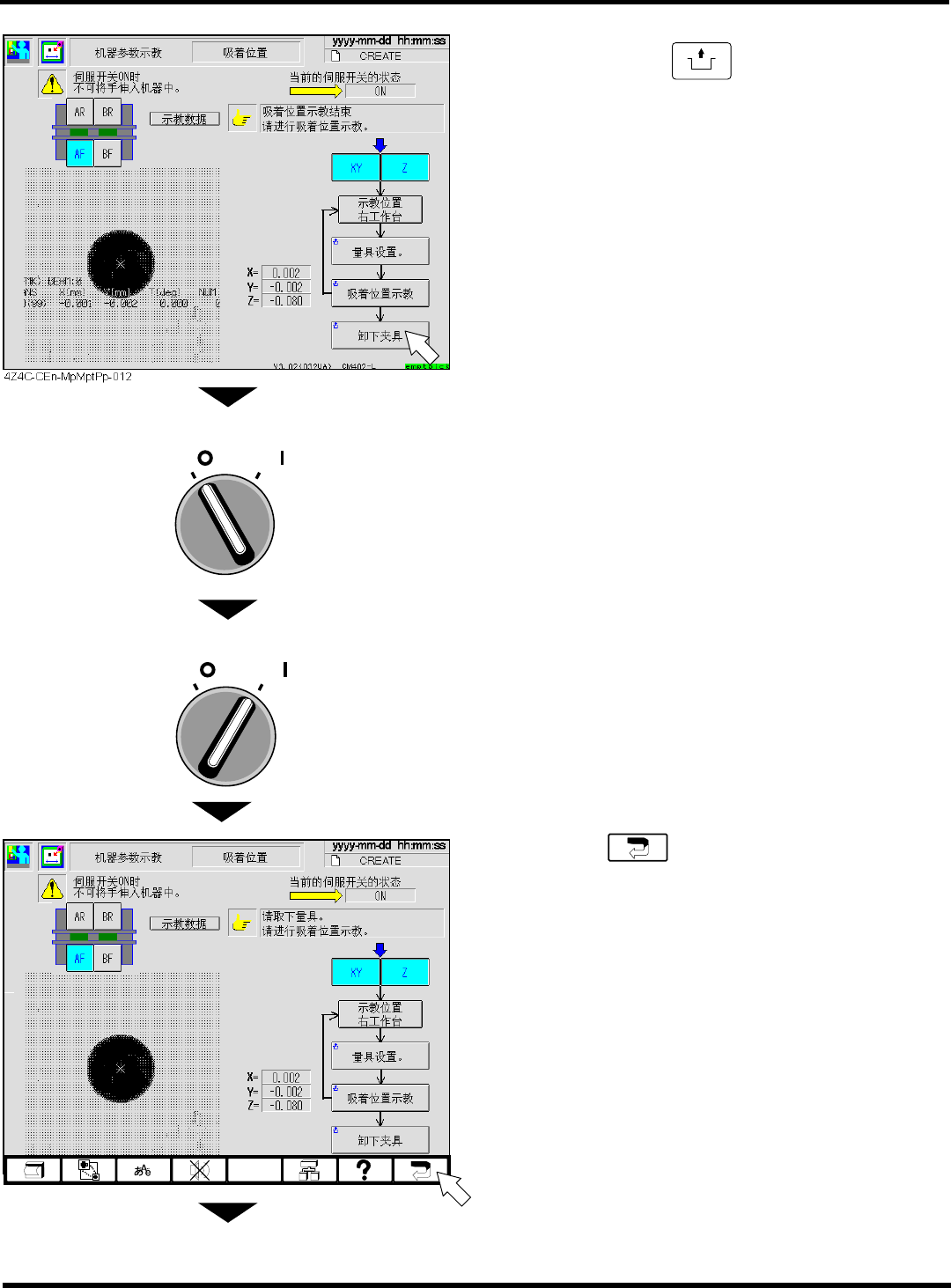 CM402 维修手册 2.2 机器参 数的示教步骤 Page 2-67 24. 把吸着位置量具 移动到所选的工作台 右端 27 号插槽上。 25. 关闭安全盖。 26. 将伺服开关置于 ON 状态。 27. 按操作面板上的 UNLOCK + [ 吸着位置示 教 ] 键。 下一页 OFF ( ) ON ( ) S E RVO 4Z4C-433P 1 4Z4C-C -MMA02-A0 3-01