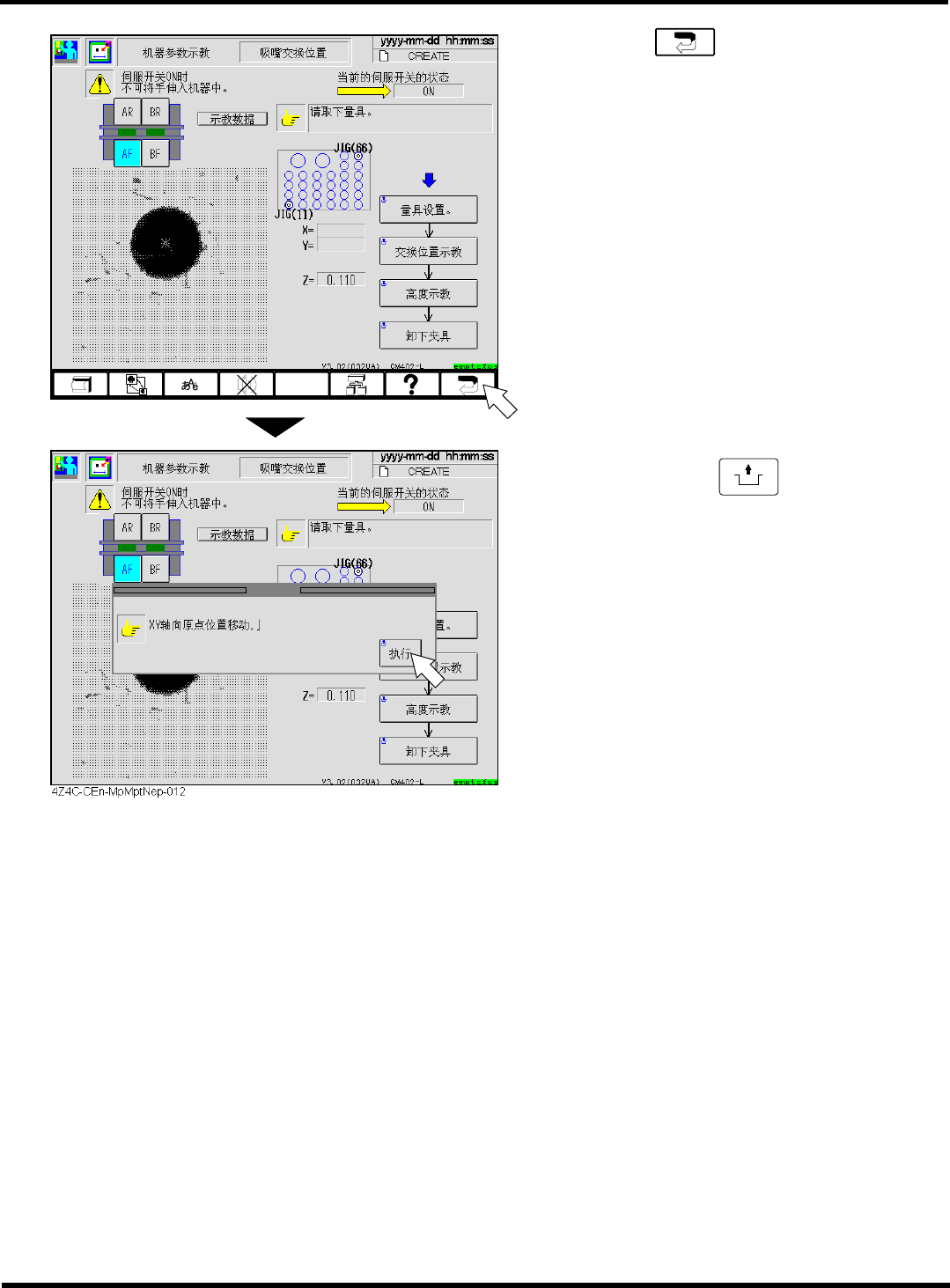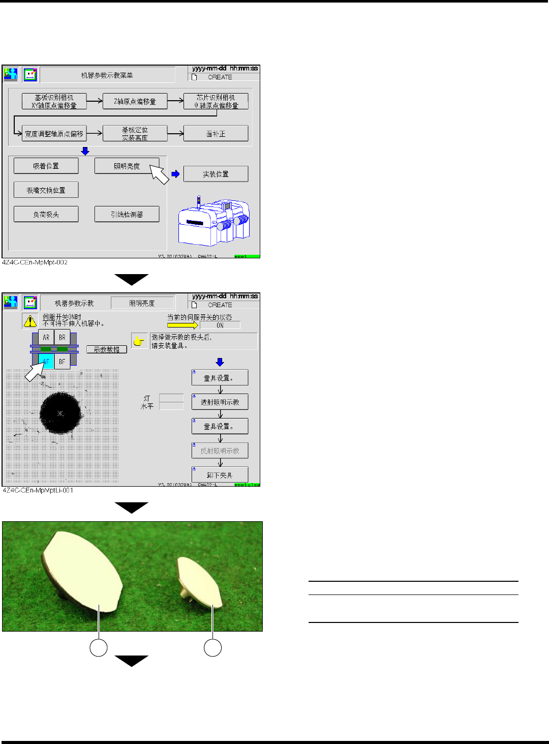 CM402 维修手册 2.2 机器参数的 示教步骤 Page 2-74 2.2. 9 照明亮度 照明亮度 照明亮度 照明亮度 1. 按 [ 照明亮度 ] 键。 2. 选择示教工作台。 3. 将量具安装在吸嘴位置 3 号上。 名称 多功能吸 头用量 具 高速吸头 用量具 下一页 4Z4C-461P 1 2 4Z4C-C -MMA02-A0 3-01