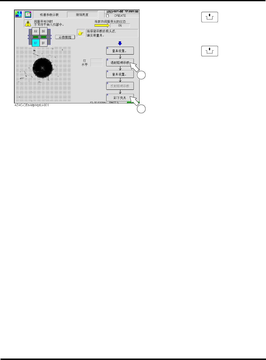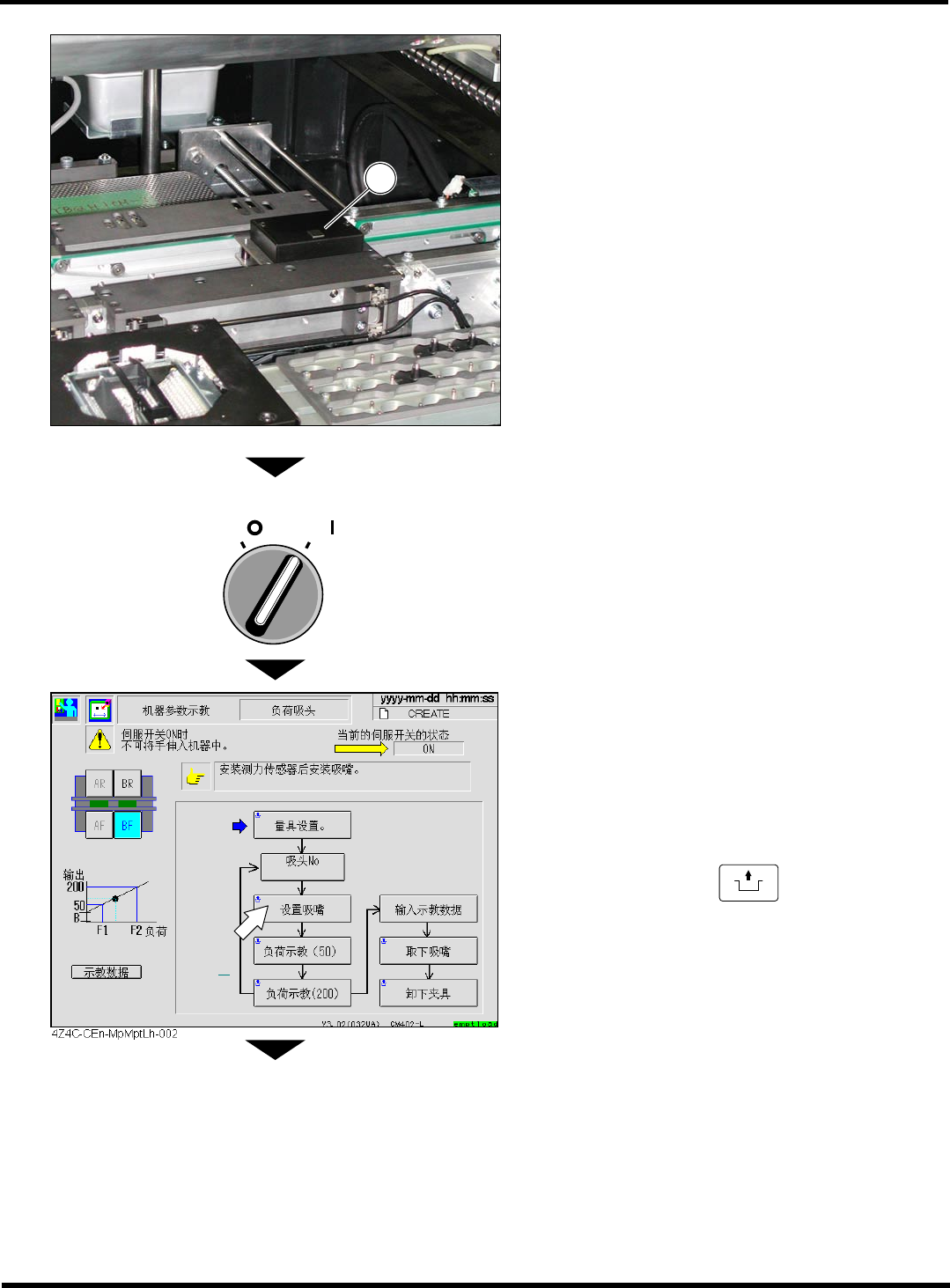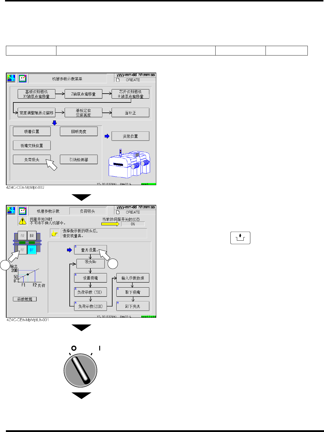 CM402 维修手册 2.2 机器参数的 示教步骤 Page 2-76 2.2. 10 负荷吸头 负荷吸头 负荷吸头 负荷吸头 只限多功能吸头 (3 个吸嘴 ) 使用工具 1003 号吸嘴 负荷测定量具 需要时间 15 分钟 前期准备 1. 按 [ 负荷吸头 ] 键。 2. 选择示教工作台。 3. 按操作面板上的 UNLOCK + [ 量具设置 ] 键。 4. 将伺服开关置于 OF F 状态。 5. 打开安全盖。 下一页 2…
