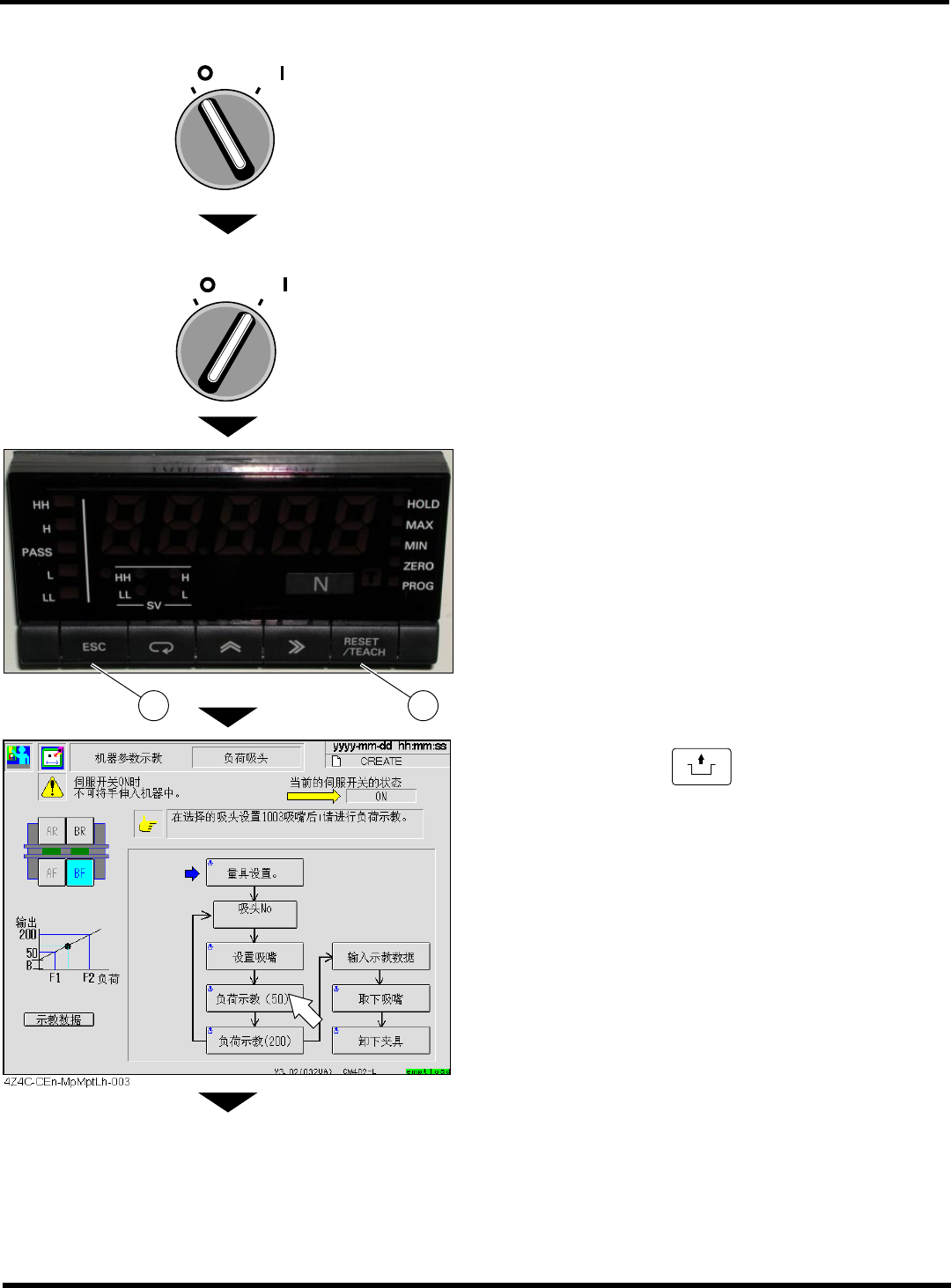 CM402 维修手册 2.2 机器参 数的示教步骤 Page 2-79 19. 按 [ 输入示教数据 ] 键。 20. 在光标 ( 反转表示 ) 栏上,输入量具显示 器的显示值。 21. 按功能键 。 22. 按操作面板上的 UNLOCK + [ 负荷示教 (200)] 键。 23. 按 [ 输入示教数据 ] 键。 下一页 2 1 4Z4C-C En-MpMfc-001 4Z4C-C -MMA02-A0 3-01
