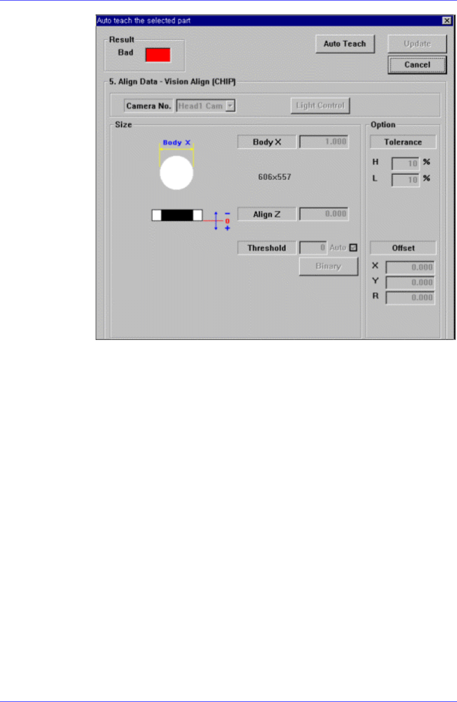 Part Registration 7-27 7.3.2. SOJ component data setting Set the align data for SOJ components. Figur e 7-18. “ Align T ype = V ision, Package Gr oup = SOJ ” dialog box <Camera No.> combo box Select…