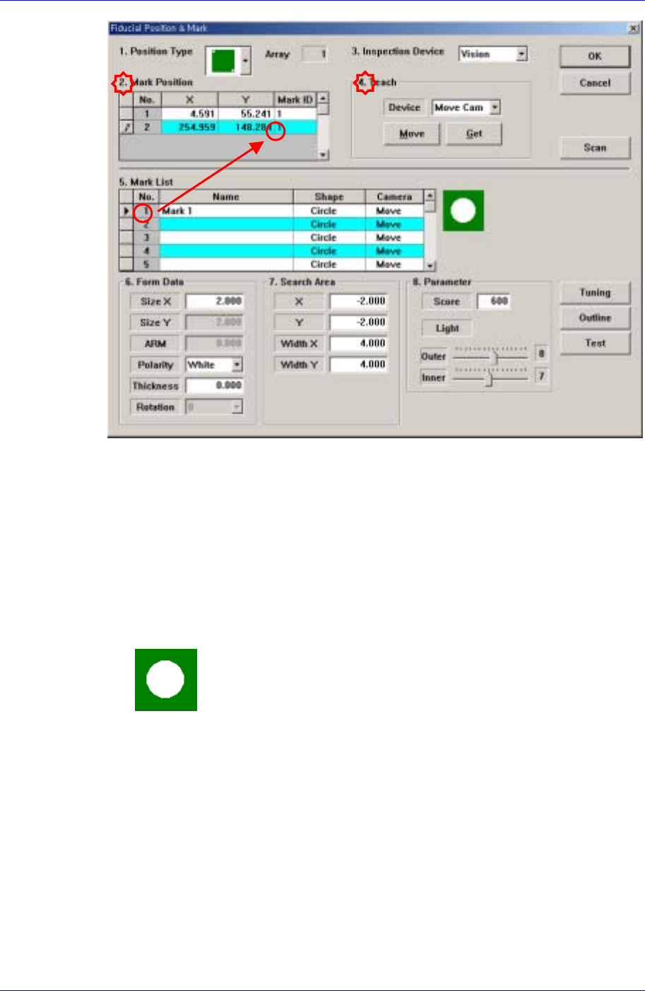 T eaching 13-3 (First Fiducial Mark) Click the <Get> button in the <4.T each > group and enter the current position in the <2.Mark Position> group. (Second Fiducial Mark)