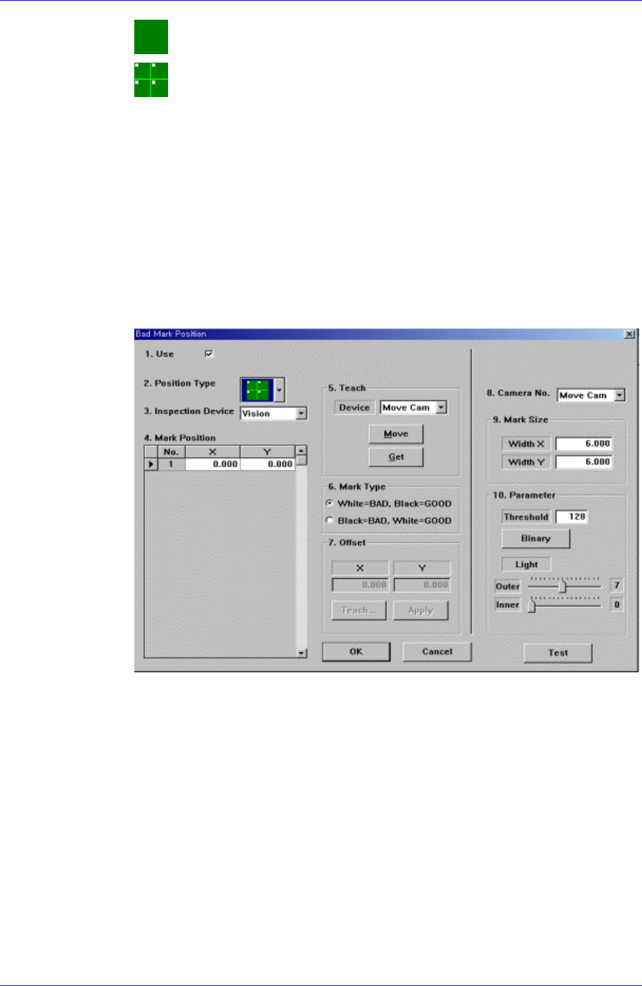 Boar d Definition 6-17 <Repeat…> button It is not explained here as it is displayed in the debug mode only. <Bad Mark…> button A bad mark is a mark that identifies whether the loaded PCB is good or bad. T…