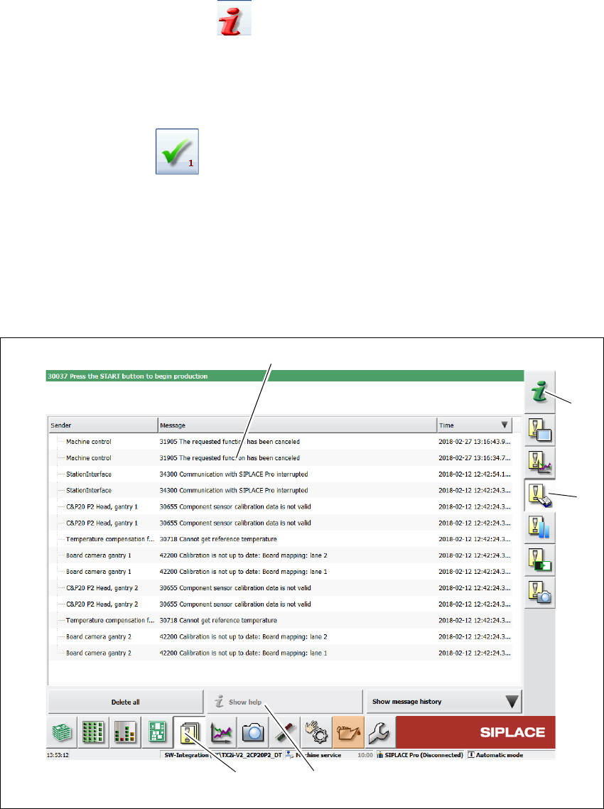5 贴片机处的工作 使用手册 SIPLACE TX 5.6 警报信息和 “ 联机帮助 ” 使用软件版本 714.0 或更新 12/2020 228 5.6.1 查看当前警报的相关信息 要查看当前警报的相关信息,单击 图标以启动工作站计算机的 帮助系 统 。 帮助系统 主窗口 将随着警报信息一起被打开。信息内 容与为当前显示且已启动帮助功能的警报相关。 如果警报已被解除,而且贴片机自动 确定了相应的解决方案,此警报将自动从状态区域中删除。…