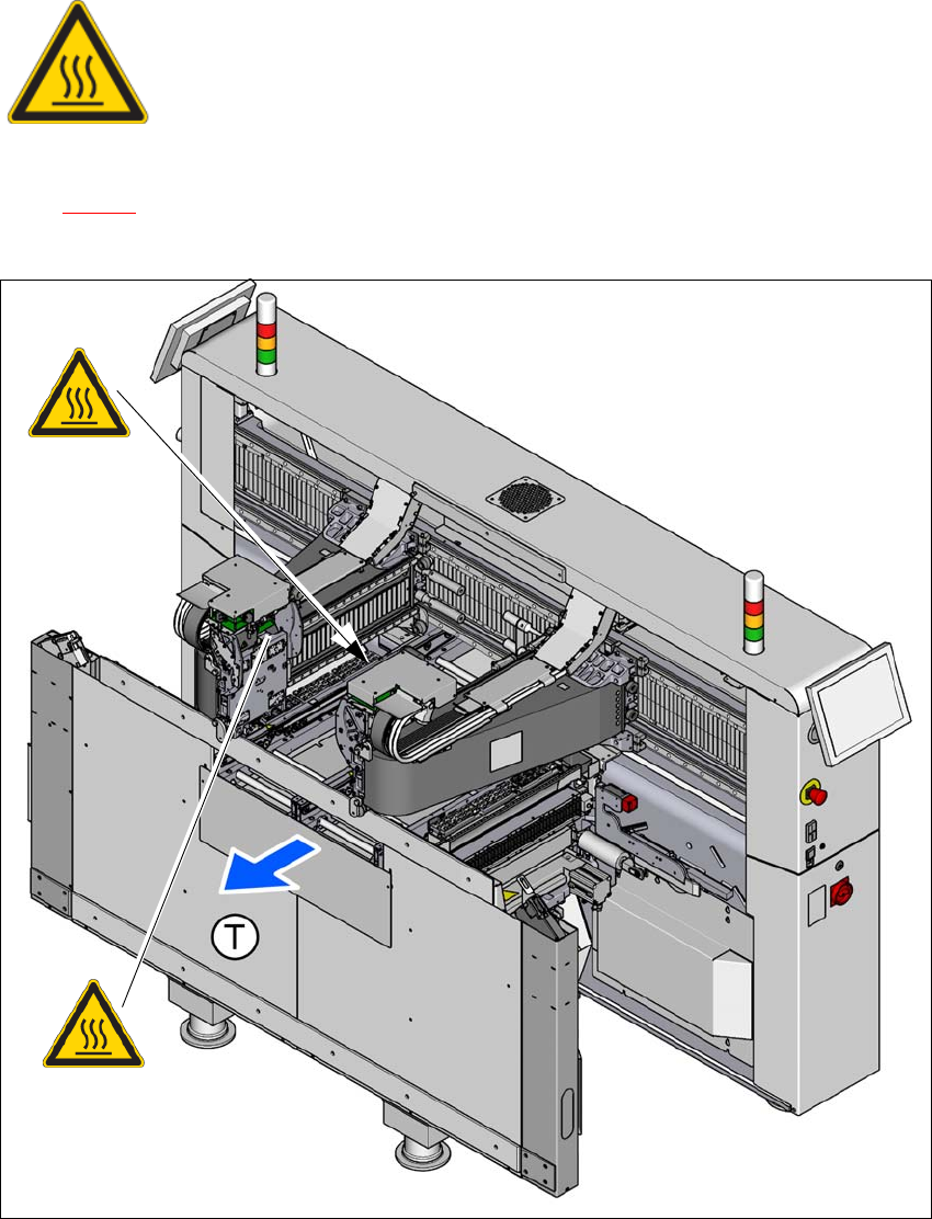 使用手册 SIPLACE TX 2 操作安全 使用软件版本 714.0 或更新 12/2020 2.2 警告标签 65 2.2.12 模块化贴片头控制单元 (MHCU) 上的高温 1,图 2.2 - 16 ,高温标签 ,部件号 03031926 -01 (每个贴片机的数量:2). 2 图 2.2 - 16 模块化贴片头控制单 元 (MHCU) 上的高温标签 - (显示的示例为 SIPLACE TX2) 2 高温导致烫伤的危险 持续工作期…