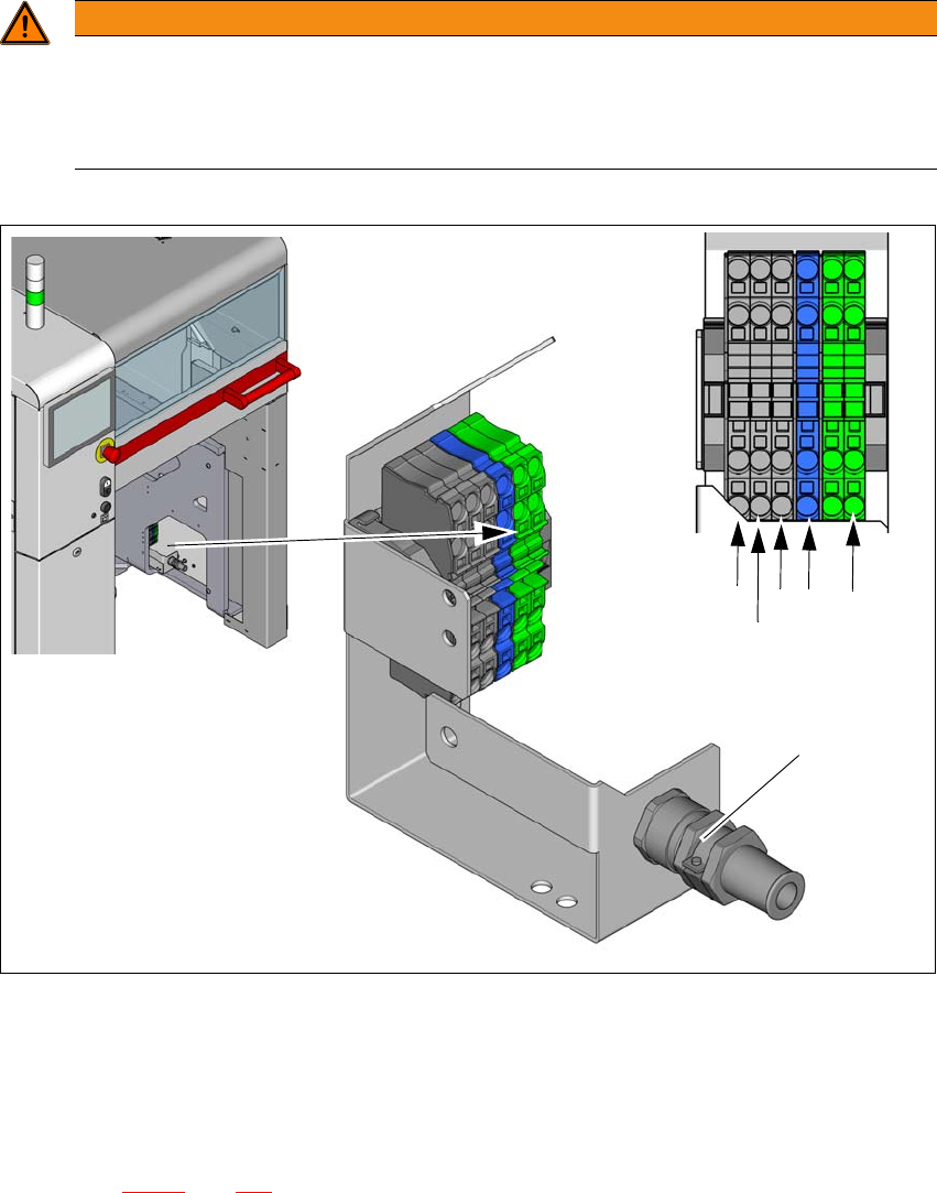 贴片机交付时无电源连接线。主电源供电线缆与贴片机输出端 1 号区段内的连接端子 (1) 相连。