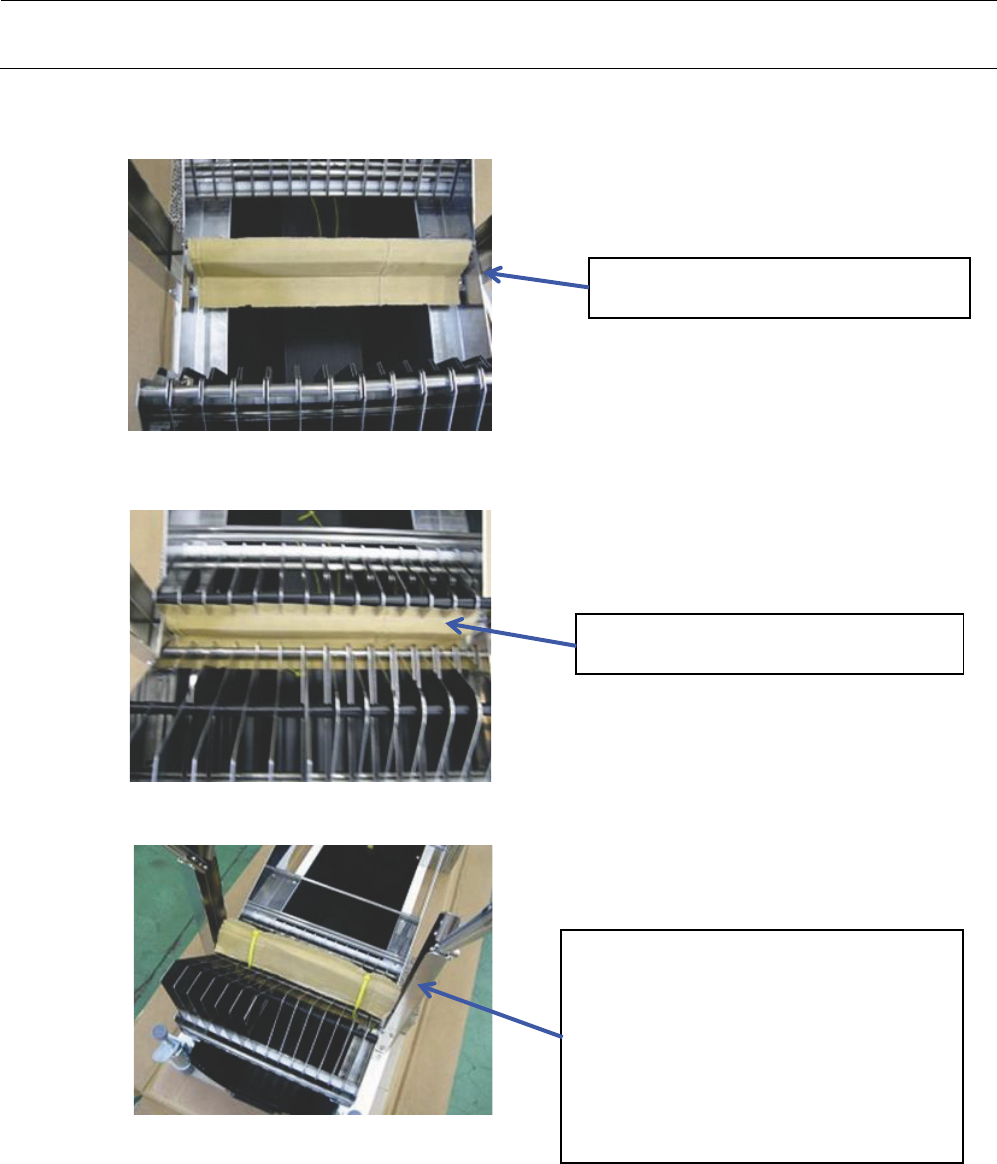 包装要领书 13 RF 对应的供料器台车请按下图所示进行包装。 用聚丙烯打包带固定。 如收得过 紧 ,杆条零件会弯曲,故只须 收紧到工作台不晃动就可以。 聚丙 烯 打包 带 与 铸 件 边 角接触的部分 请用气泡包装膜等保护好。 请用气泡包装膜将分 离板集中包裹,固定到废料 箱内。固定位置 是靠近身前一侧。 40084676 :分离板 × 13 块 分离板固定部位
