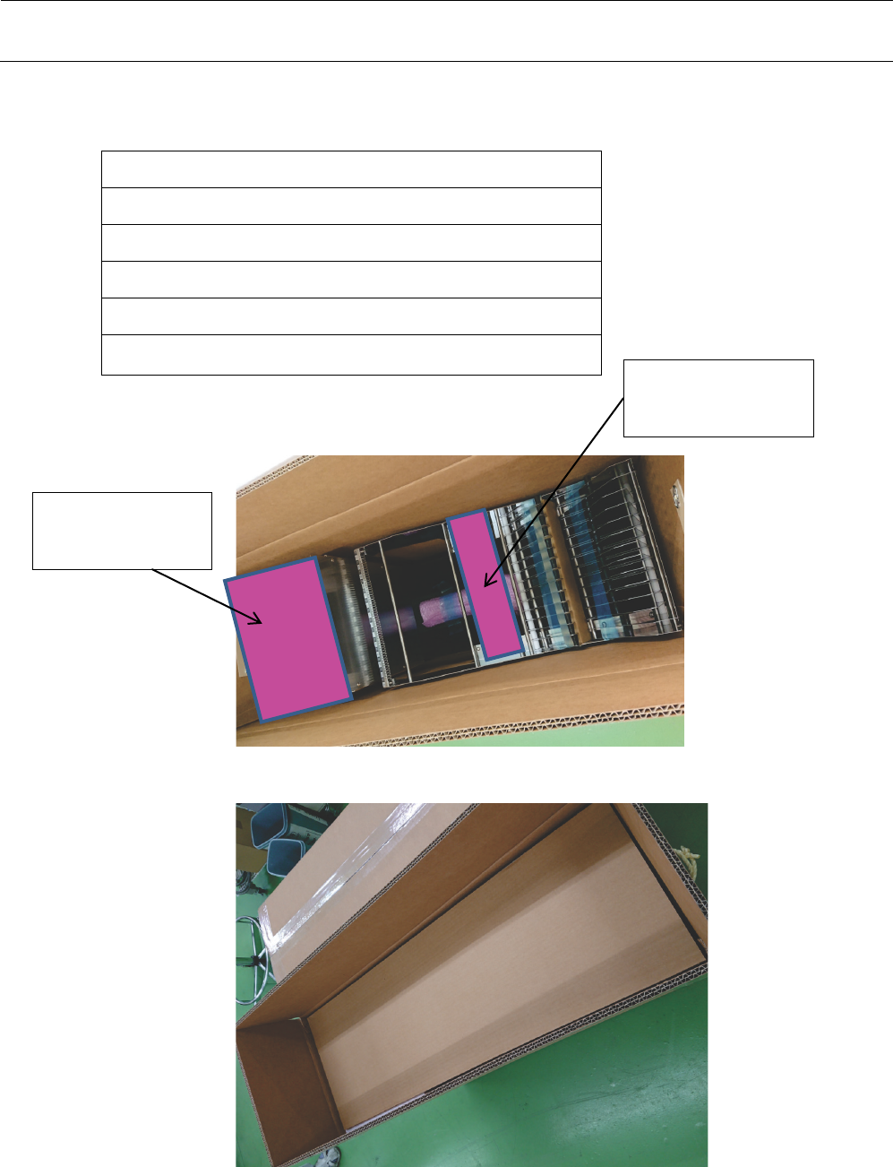 包装要领书 17 放入 40211984 REE L_BOX_BASE_UNIT _CARTON 。 1) 在包装纸箱的外部贴上内装物标签。( 2 处。如是相同内容,无指定形式。) 另外,在包装纸箱的底面钉 4 个封装钉,然后用胶带封好。底部铺放上下垫板。 盖上 40169382 :加强肋板。 扎线扣带 HX006740000 :以固定。 扎线扣带 只要使卷 盘架 不松 动即可,不要扣 得太紧。 倒下卷盘架。 标签 胶带 胶带 胶带