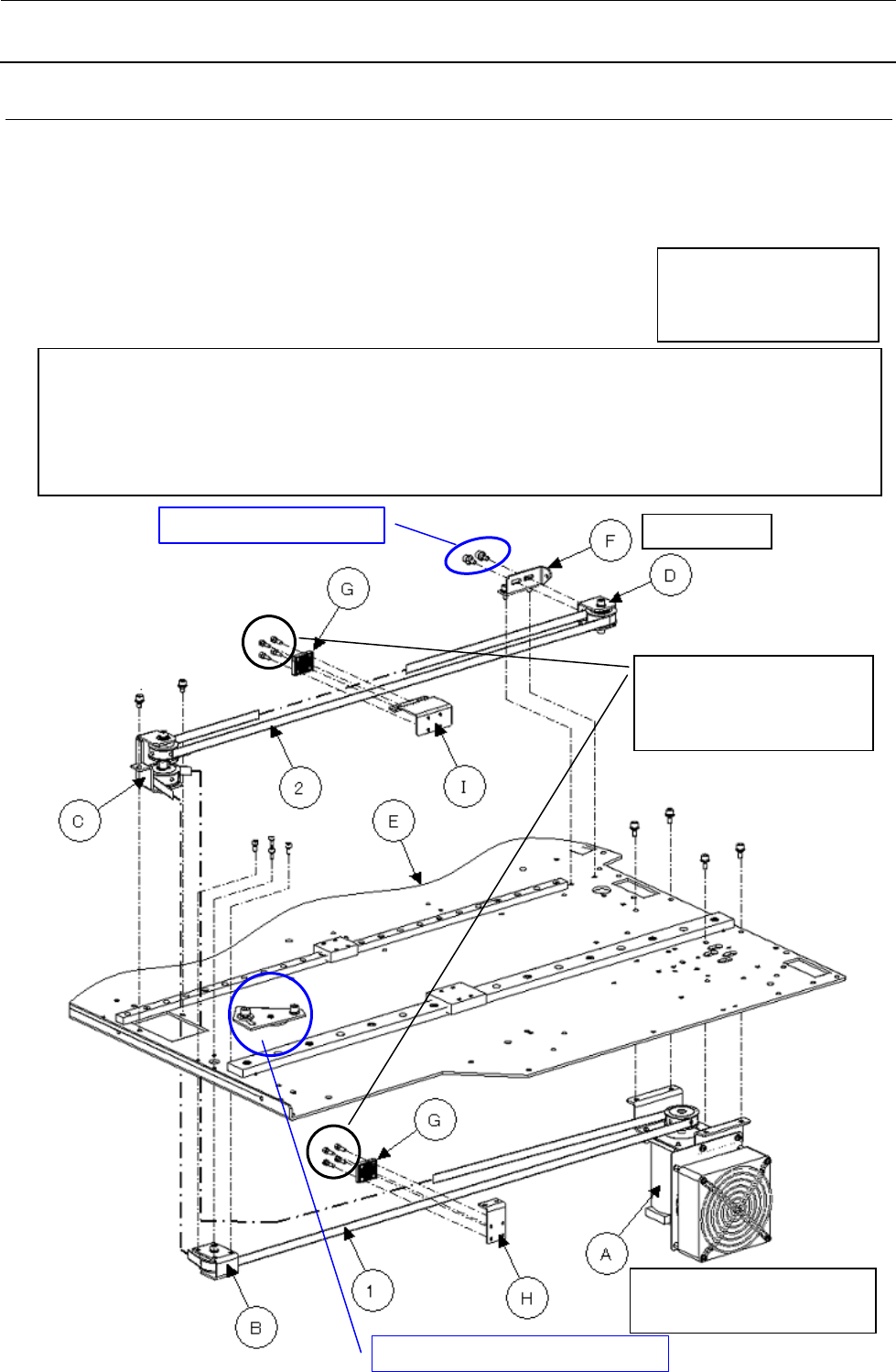 请拆下 Y 皮带压板(G)、Y 皮带连接器(H)、YJ 皮带连接器 BR(I)各个固定螺丝,从 Y 皮带①及
