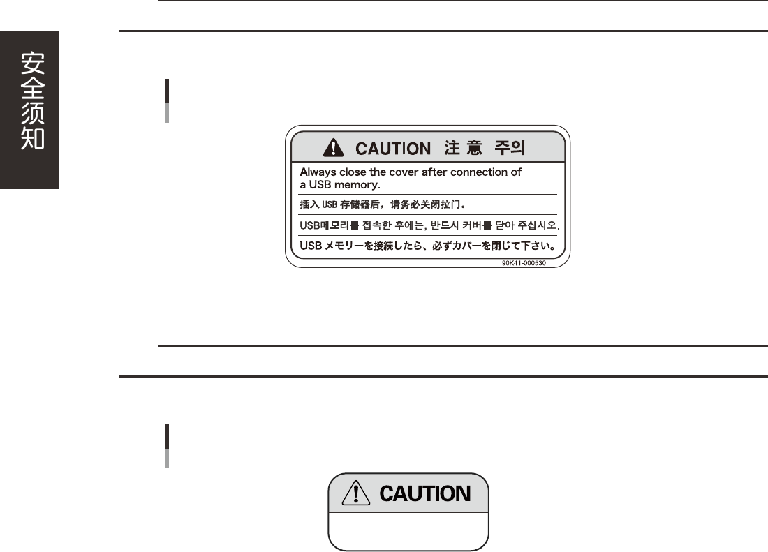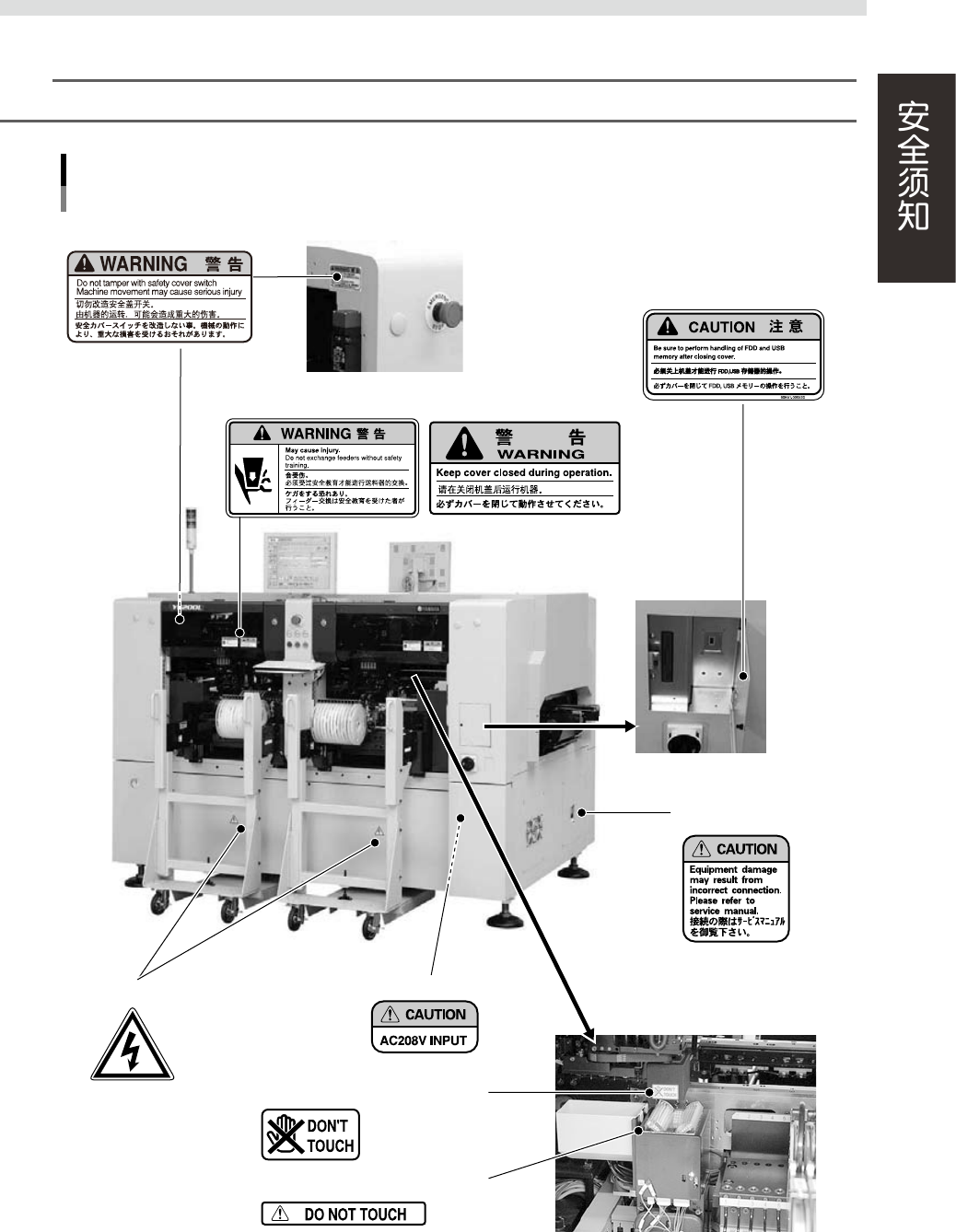 为了安全使用机器,如下图所示,在主机各个部分张贴了警告标贴,务必严格遵守标贴指示。