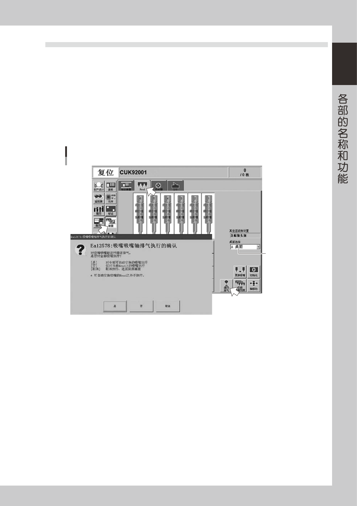 实施排气清洁吸嘴轴的过程中,如果因紧急停机和联锁等原因迫使机器停机,贴装头会立即上升,这时还持续排气的话,可