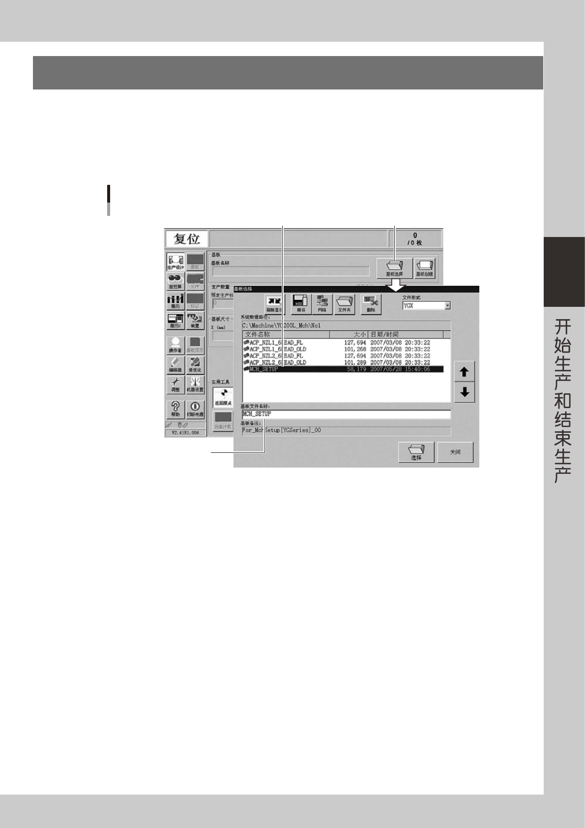 1. 如果还没有选择基板程序,按 [ 生产设计 ] 画面的「基板选择」按钮,显示已登录的基板程序。
