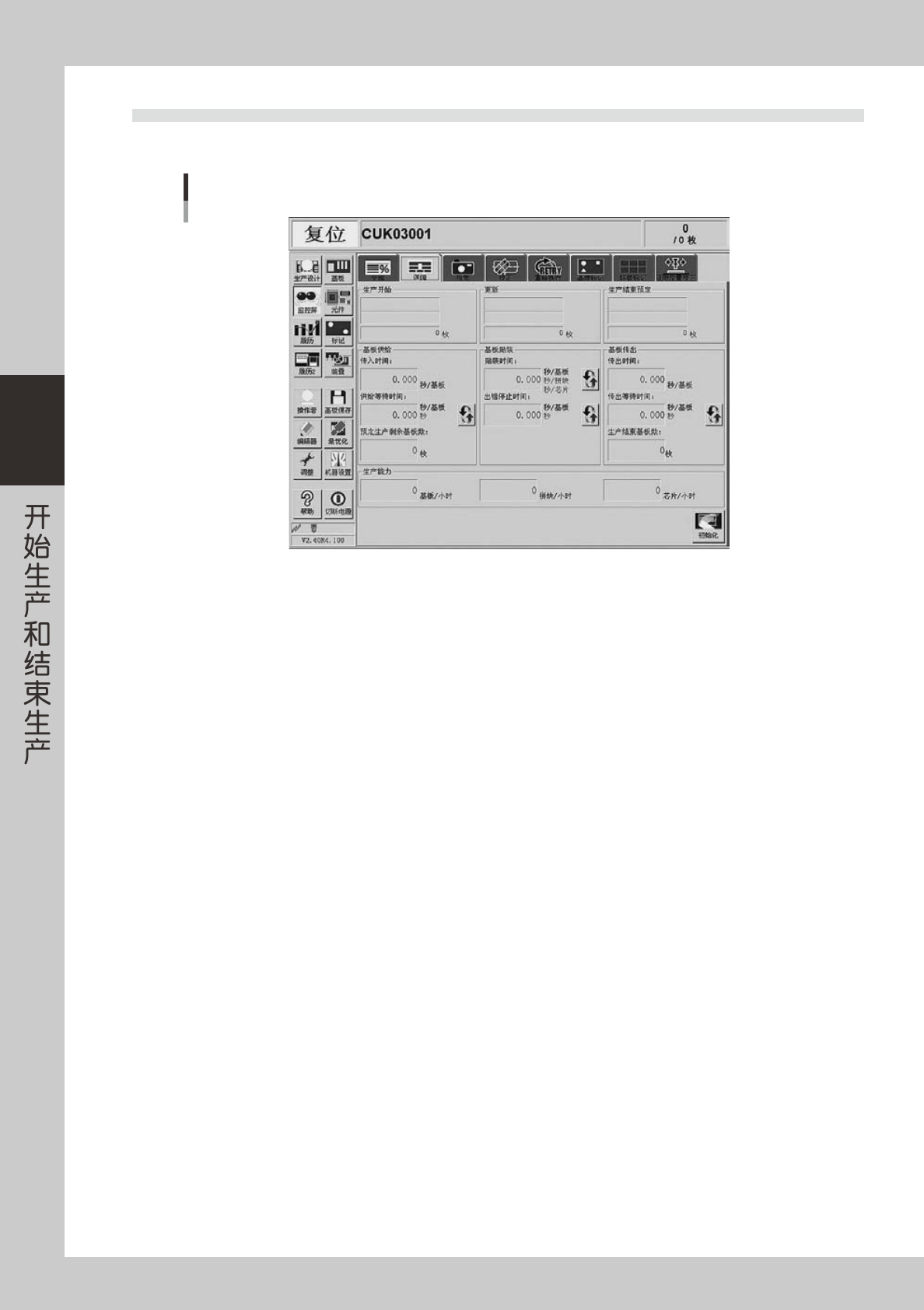 显示生产开始的时间 ( 完成基板选择的时间 )。一般,生产数量设定为“0”。