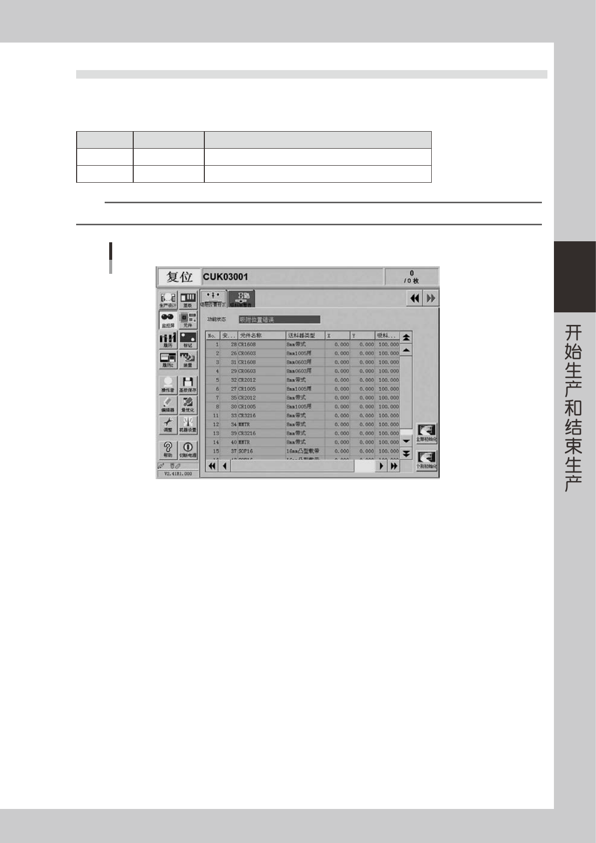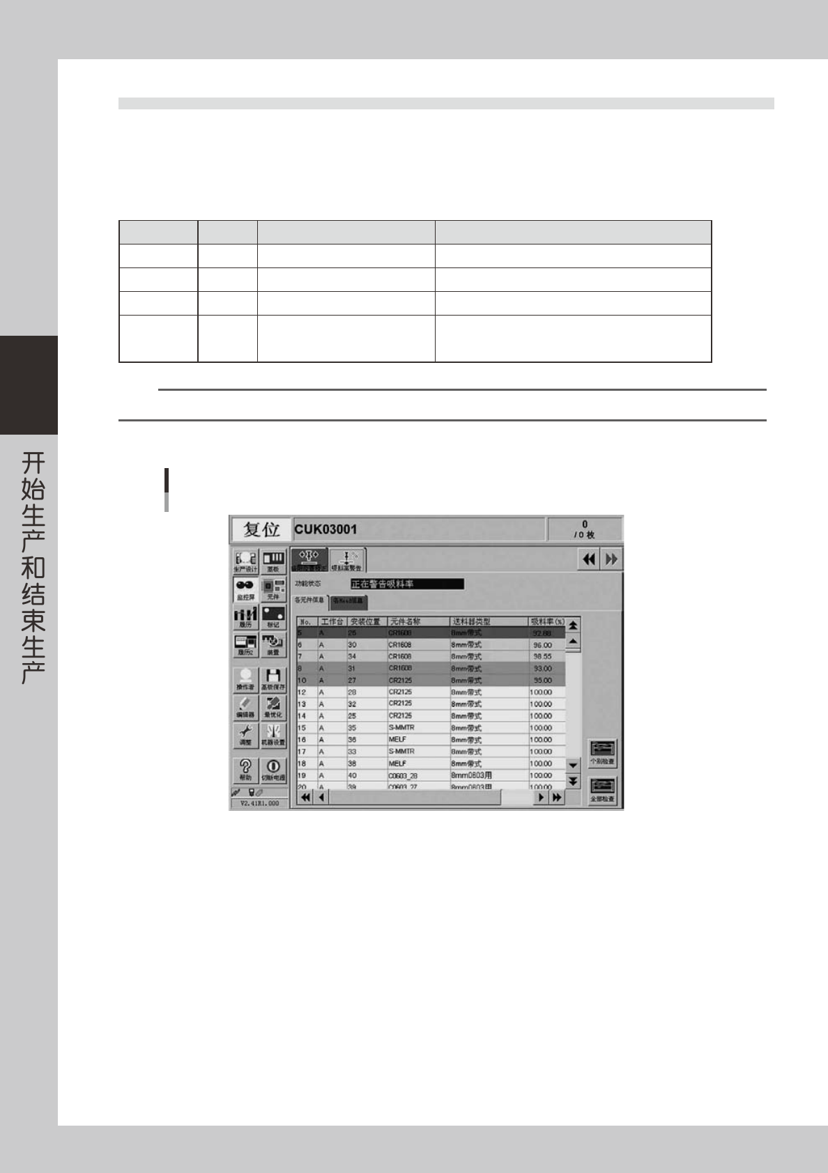 3-18 3 3 . 9 吸 料 率 警 告 该 画 面 在 使 用 吸 料 率 警 告 功 能 时显 示 。 通 过 该 画 面 可 以确 认各元 件、 各 贴 装 头 的 元件 吸 料 率 的下 降 情 况 。 分 别 选 择 各选 项 卡 , 切 换 显 示 内 容。 吸 料 率 在 贴 装 组 的 贴 装 完 成 后, 立 即 更 新。 但 是 如 果 没 有 使 用 该 元 件 或 该 贴 装 头, 该 行 不 会 显…