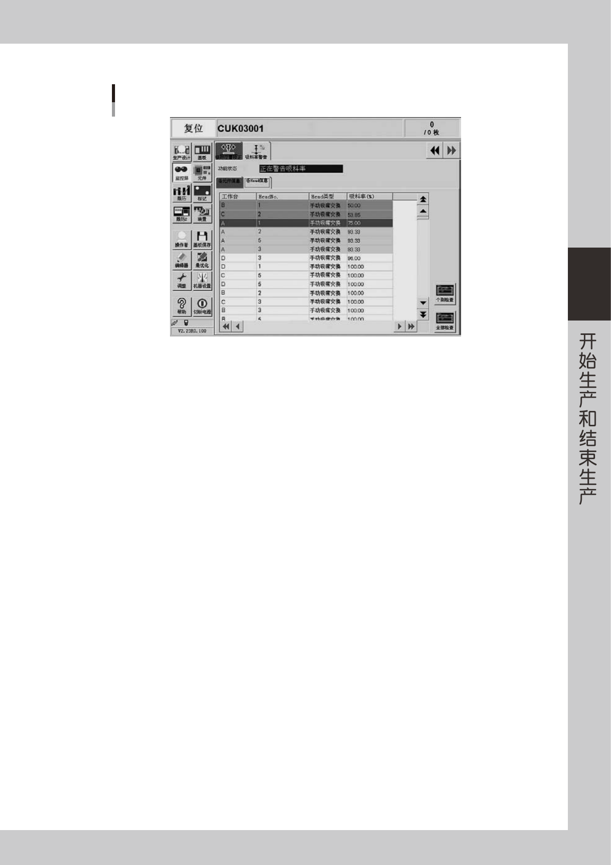 如果吸料率在 [ 警告 ( 红色 )]% 的范围内,单击 [ 个别检查 ]