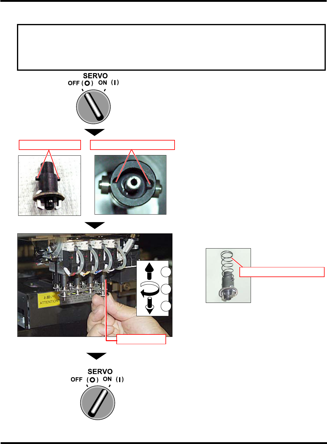 CM602-L 维修手册 1.4 140 小时检查一次 [ 一周一次 ] Pa ge 1-63 C) 将吸嘴座安装在移载吸头上 要求 该维护作业,应在电源开关处于 ON ( I ) 的状态下进行。在吸头的动作范围内进行作 业时,请务必使伺服开关处于 OFF (O) ,并打开安全盖。 ( 打开安全盖可以切断向 XY 电机的供电。 ) 1. 将伺服开关置于 OFF (O) 。 2. 打开安全盖。 3. 确认吸嘴座的摺动动作。 • 请将吸嘴座…