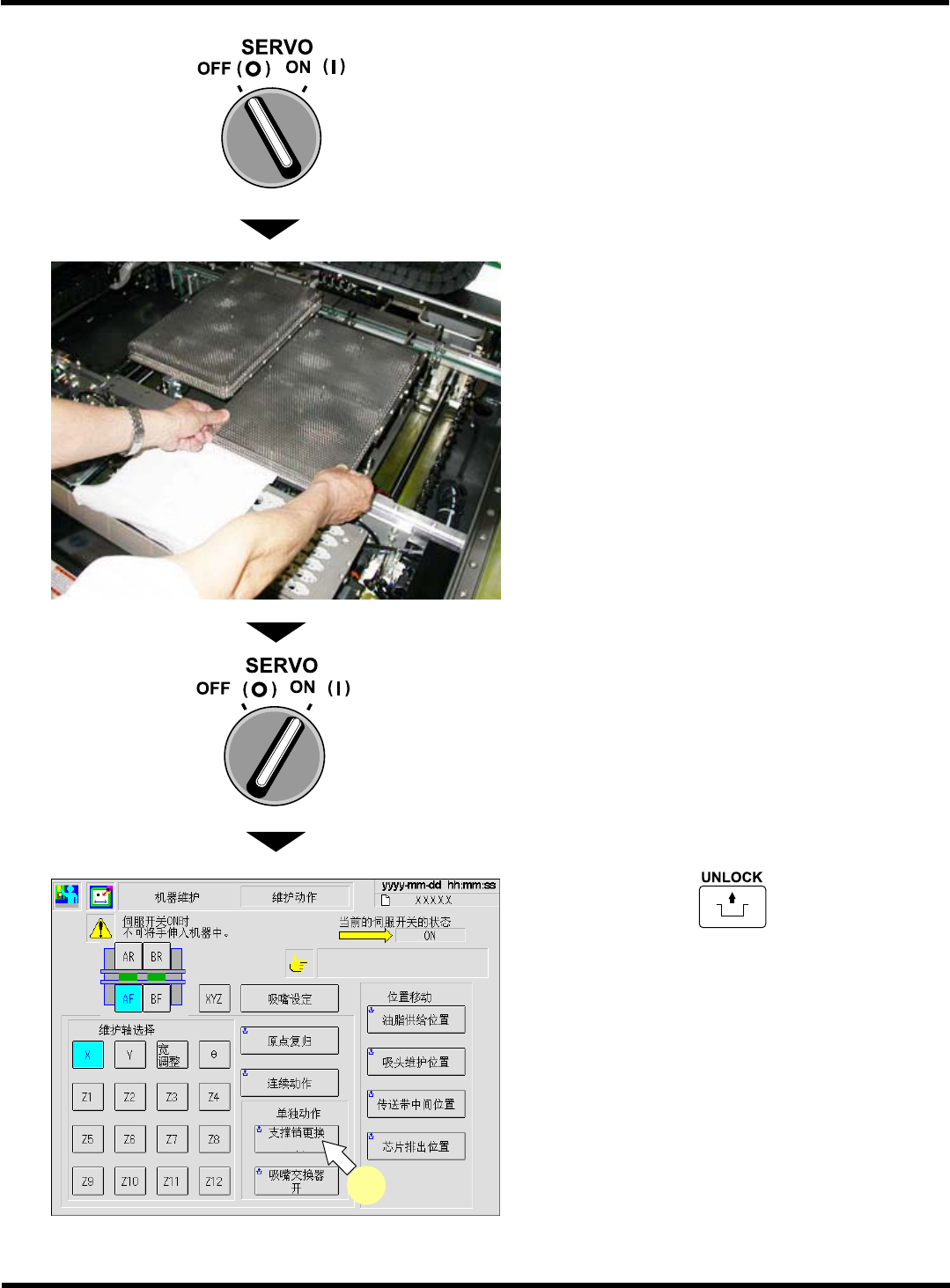 CM602-L 维修手册 1.6 560 小时检查一次 [ 每月一次 ] Page 1-92 1.6.2 XY 装置注油 ∗ 在此以高速吸头 (12 吸嘴 ) 为例进行了说明, 而对通用吸头 (8 吸嘴 ) 、 多功能吸头也都应按照同样 步骤进行操作。 使用工具 润滑脂枪·棉纱布 需要时间 35 分钟 通知 在进行此作业前,请务必阅读 “ 关于线性电机的使用 ” 。 请按下述步骤,在 XY 装置的线性轴承上注油。 ∗ 维护作业时有必要卸…