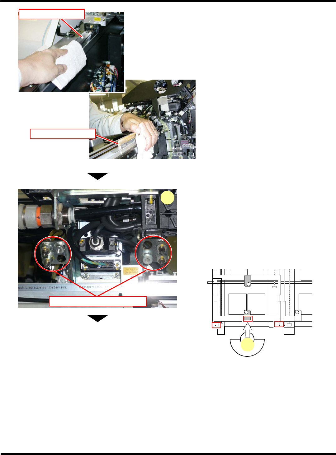 CM602-L 维修手册 1.6 560 小时检查一次 [ 每月一次 ] Page 1-93 3. 用干净的棉纱布擦拭附着在 X 轴线性轴 承,以及 Y 轴线性轴承上的旧的润滑脂。 4. 在 X 轴线性轴承上, 从润滑脂注入口注油。 • 请使 X 轴在整个行程上滑动的同时, 进行注油。 • 在每 1 处润滑脂注入口压出 0.5 次 ( 约 0.45 cm 3 ) 为标准。 • 使用润滑脂 : MP 润滑脂 2S 下一页 EJM8A-C-…