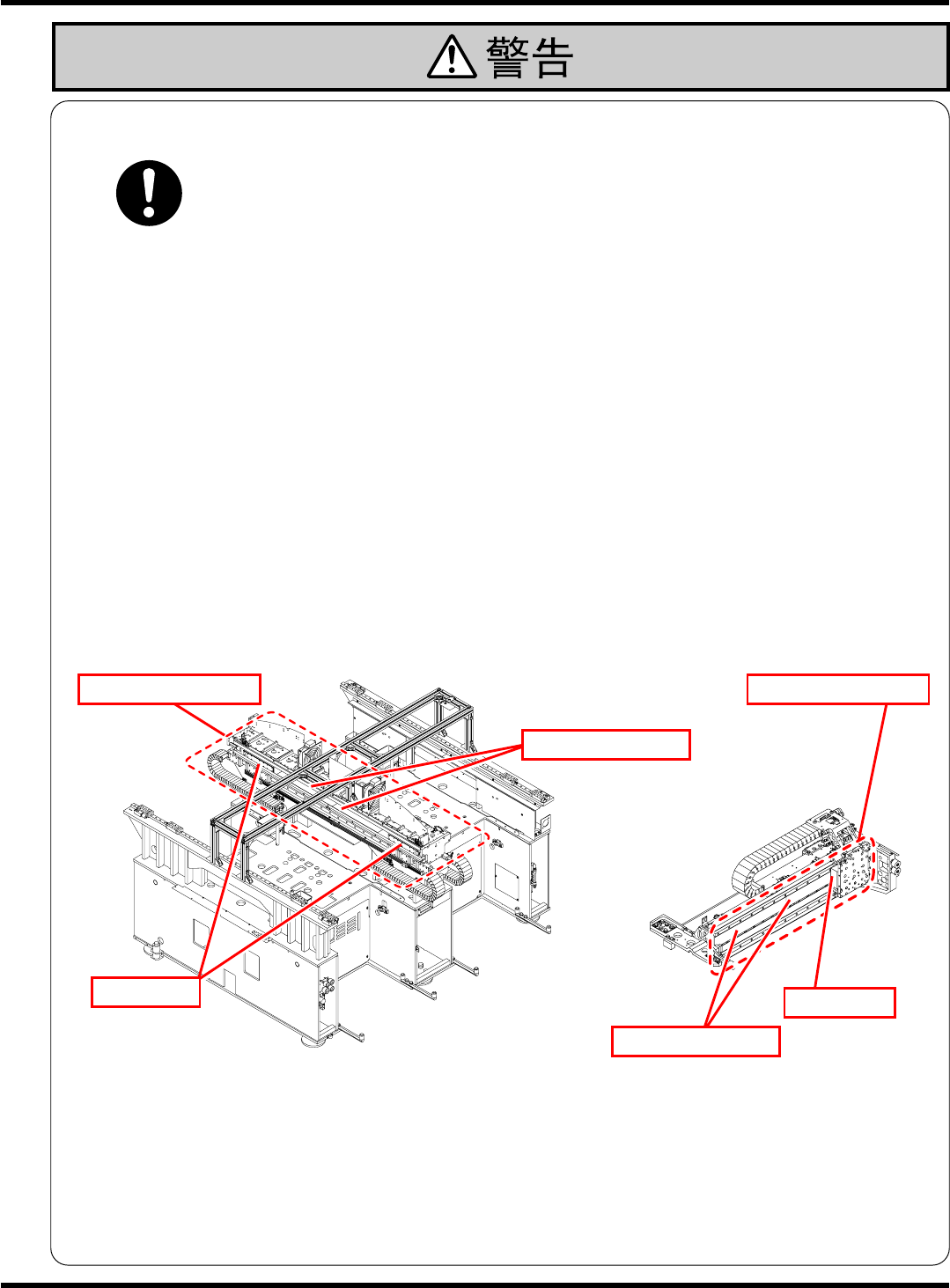 CM602-L 维修手册 16 因进行生产材料的 补给·机种切换· 调整等操作而需要 将手或身体的一部 进 入机器的可动部内 时,应遵守下述事 项 机器会运转,有可能造 成伤害。 另外,也有可能导致触 电。 根据相应的作业内容, 分为下述 3 个阶段。 进行控制 BOX 等的修理时 --------------------------------------------------------- - 停止向本机器供给电源 。 …