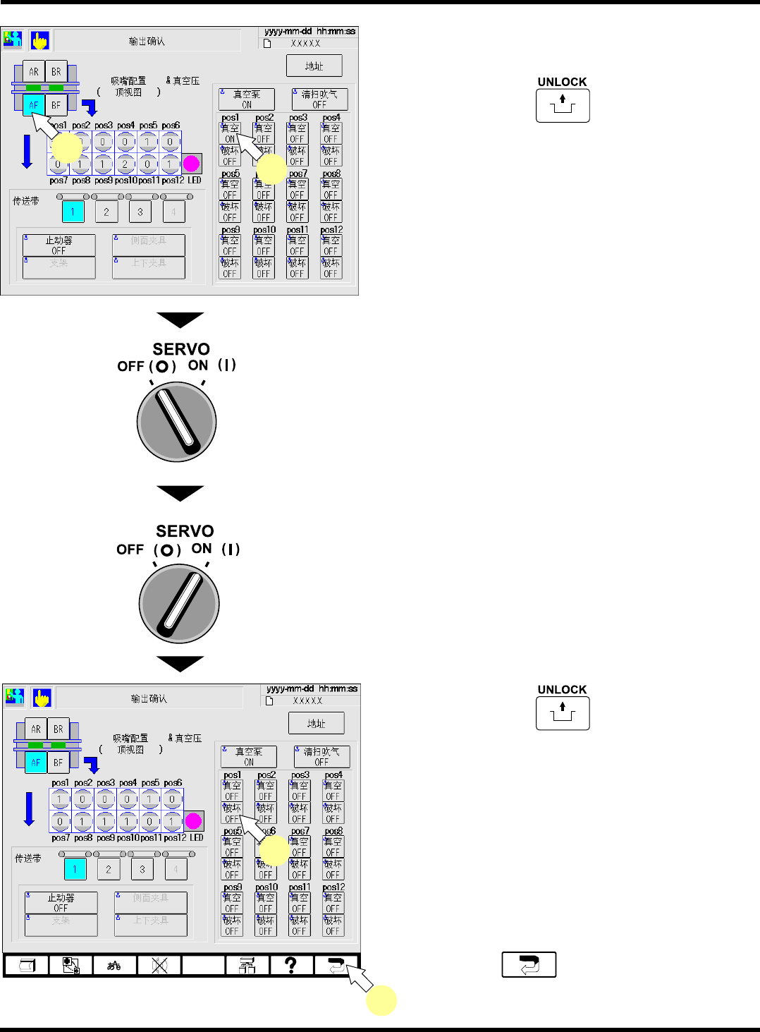 CM602-L 维修手册 1.10 消耗零件的更换 Page 1-154 6. 选择更换阀的工作台。 7. 按操作面板上的 + 将阀更换后 的 pos 的 [ 真空破坏 ] 。 • 显示状态将从 OFF 变为 ON 状态。 8. 将伺服开关置于 OFF (O) 。 9. 确认从吸嘴处喷出的用于真空破坏压力的 空气。 ∗ 因周围的噪音等而听不到喷出声时, 请打开安 全盖,用手指靠近吸嘴尖端进行确认 。 10. 将伺服开关置于 ON ( I…