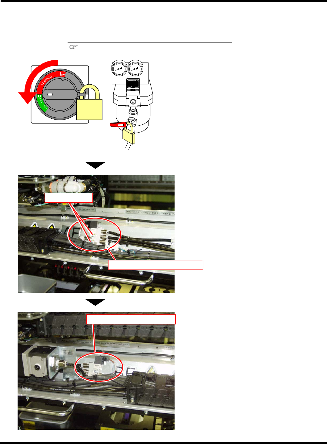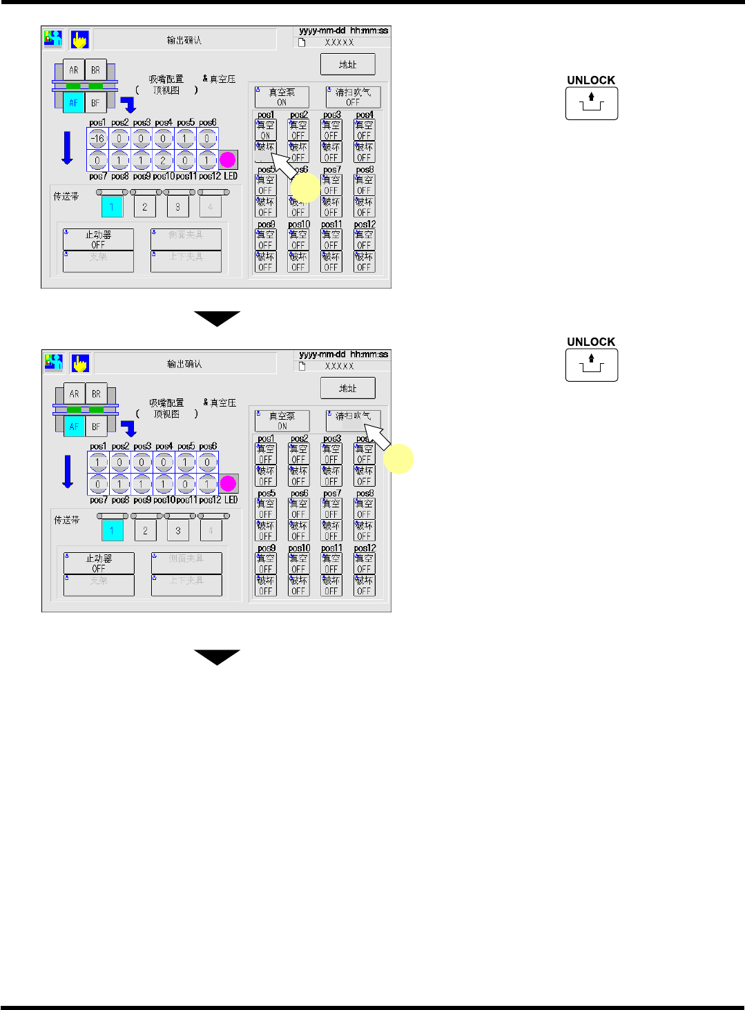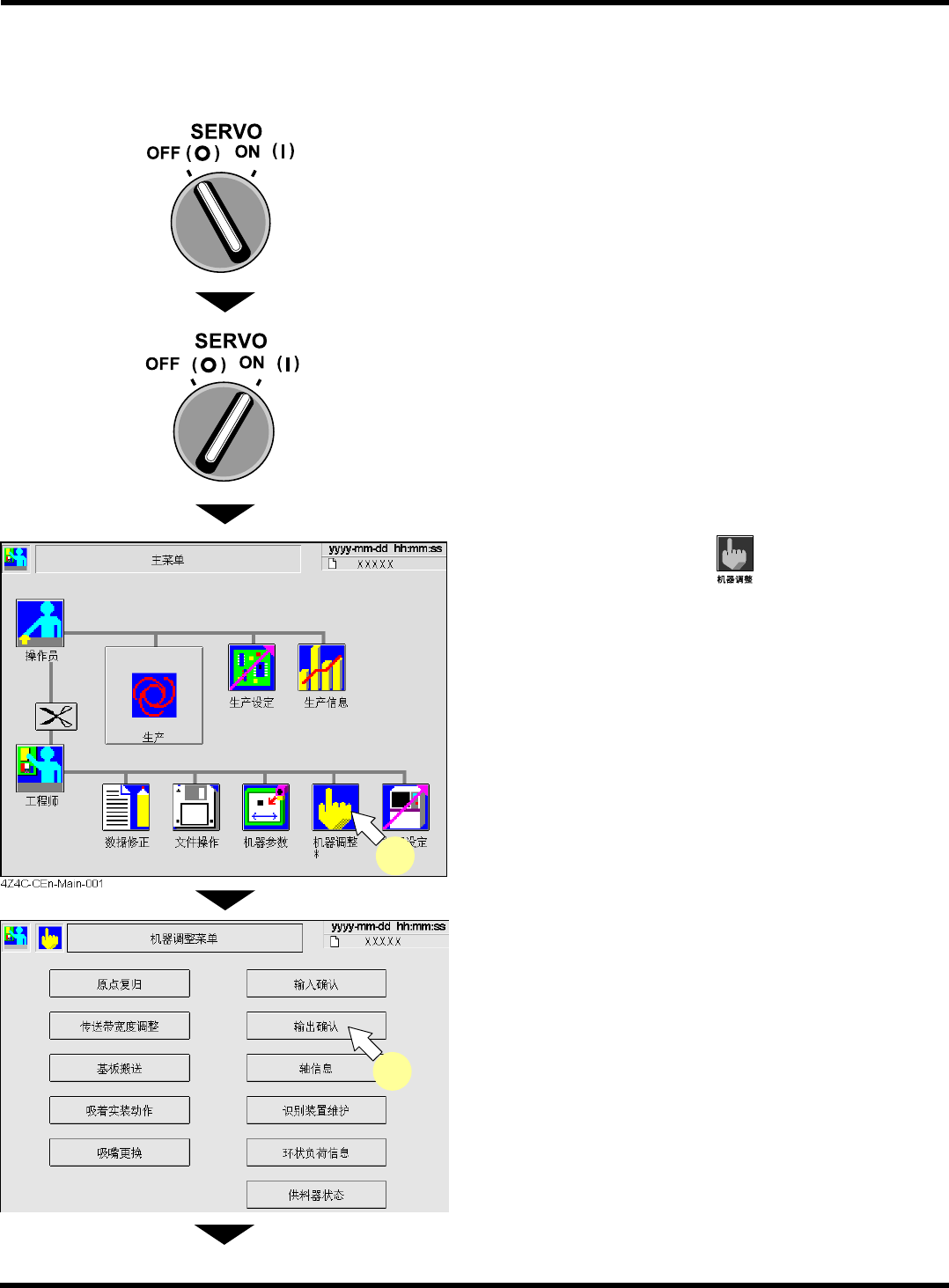 CM602-L 维修手册 1.10 消耗零件的更换 Page 1-170 动作确认步骤 ∗ 在此以高速吸头 (12 吸嘴 ) 为例进行了说明,而对通用吸头 (8 吸嘴 ) 、多功能吸头也都应按照同 样步骤进行操作。 1. 将伺服开关置于 OFF (O) 。 2. 在换完清扫阀的工作台的吸头的 pos1 上 安装吸嘴。 3. 将伺服开关置于 ON ( I ) 。 4. 按 < 主菜单 > 画面上的 。 • 机器调整的菜单画…