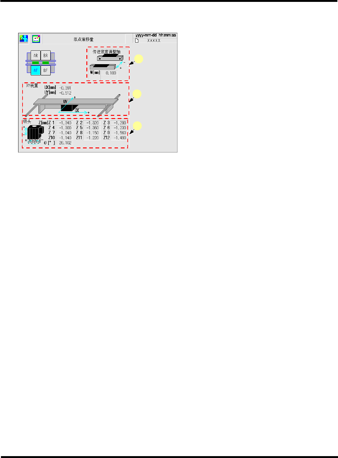 CM602-L 维修手册 2.1 关于机器参数 Page 2-2 2. 2.1 关于机器参数 机器参数的菜单画面可 以按下述步骤 显示。 1. 按主菜单的 。 • 机器参数的菜单画面将 被显示。 2. 按要确认的机器参数的按钮。 ∗ 这里作为一个例子,按 的是 [ 原点偏移量 ] 。 3. 确认参数。 • 各参数的画面详情, 请参照下一页以 后的说明 。 • 画面为高速吸头 (12 吸嘴 ) 。 EJM8A- C-MMC02- A01-…