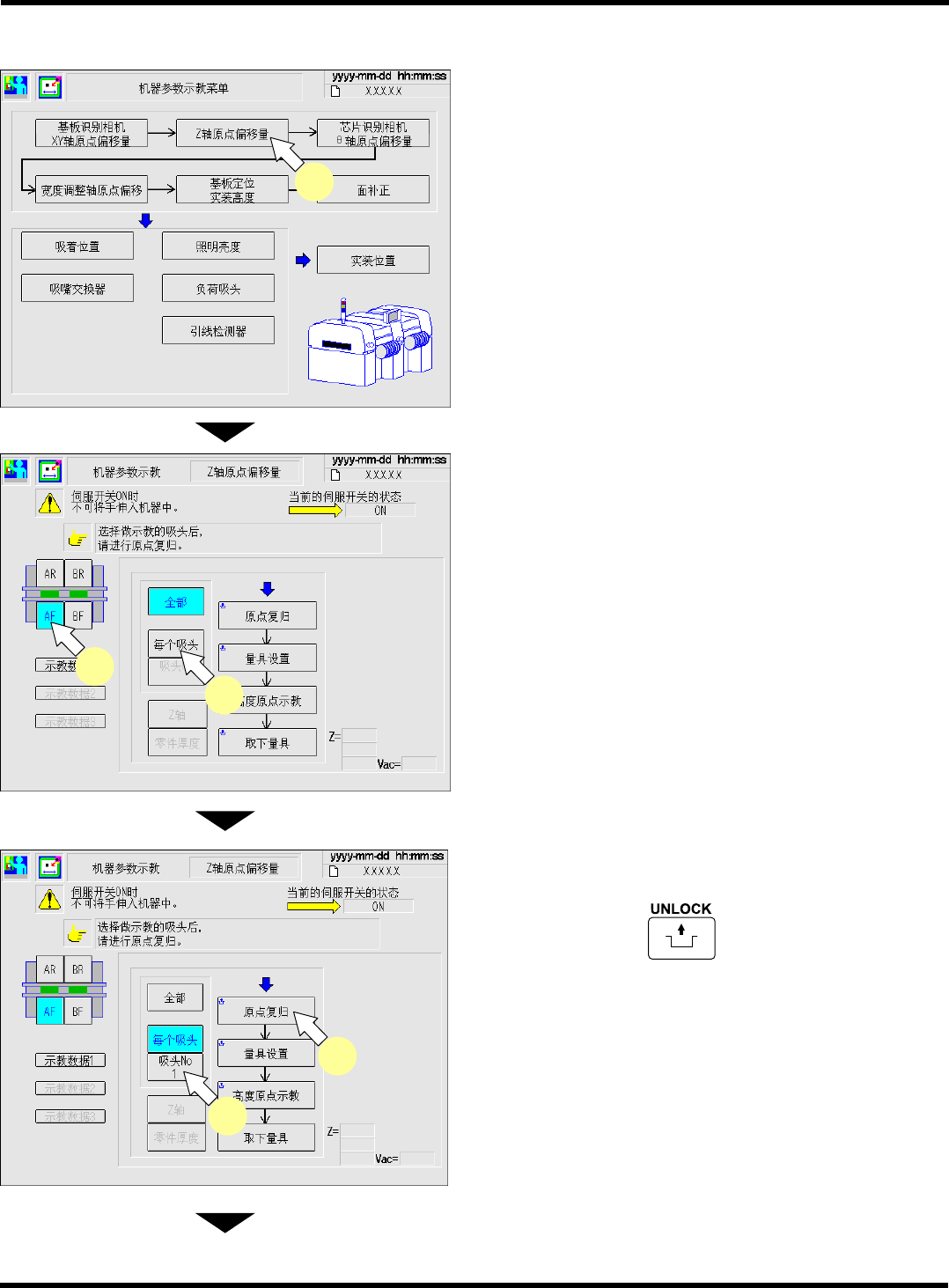 CM602-L 维修手册 2.2 机器参数的示教步 骤 Pa ge 2-44 B) 使用 1 根 130S 吸嘴时 ( 每个吸头的示教 ) 1. 按 [Z 轴原点偏移量 ] 。 2. 选择要进行示教的工作台。 3. 按 [ 每个吸头 ] 。 4. 选择吸头 No. 。 5. 按操作面板的 + [ 原点复归 ] 。 下一页 EJM8A- C-MMC02-A 02-01 EJM4A -Mp-0039 1 EJM8A -Mp-0043 2 3…