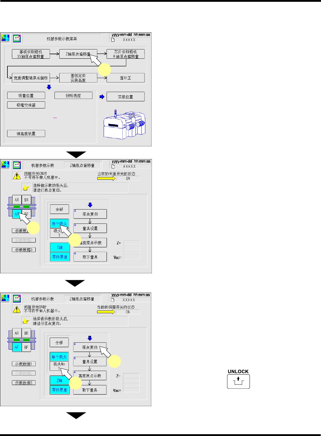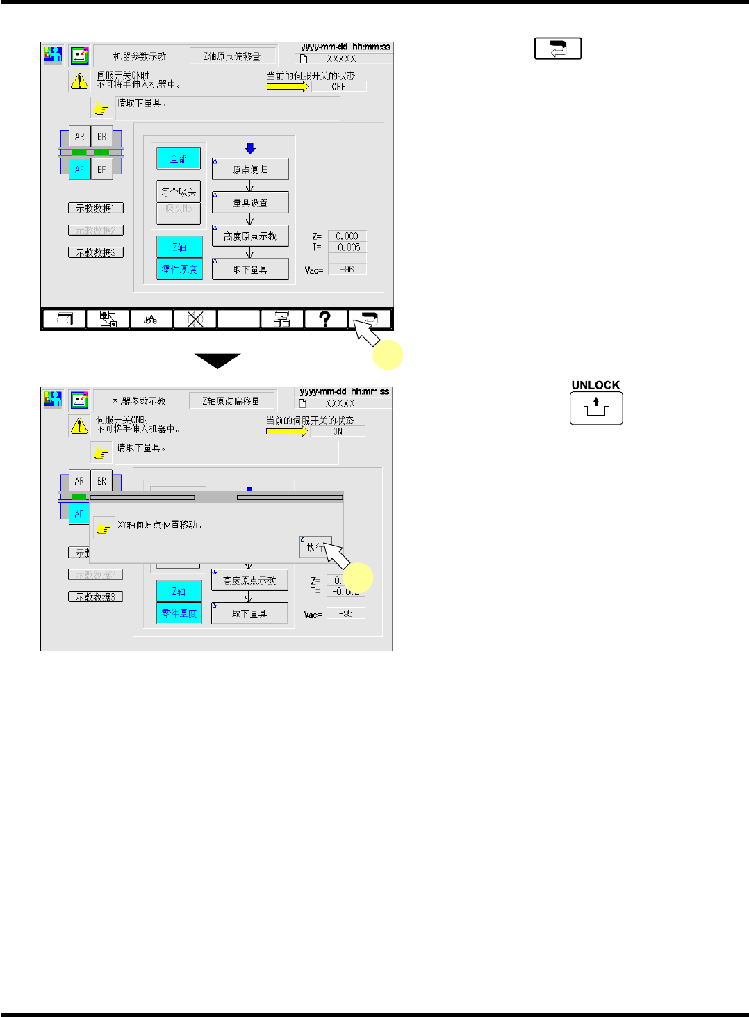 CM602-L 维修手册 2.2 机器参数的示教步 骤 Pa ge 2-51 17. 按功能键的 。 18. 按操作面板上的 + [ 执行 ] 。 EJM8A -Mp-0012 17 EJM8A -Mp-0013 18 EJM8A- C-MMC02-A 02-01