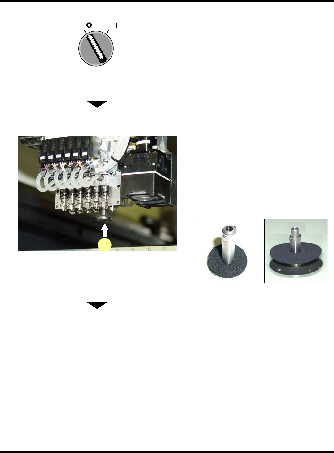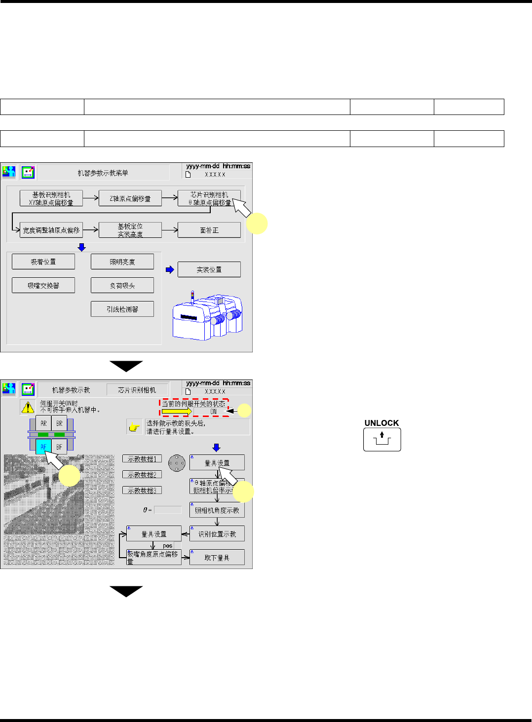 CM602-L 维修手册 2.2 机器参数的示教步 骤 Pa ge 2-65 4. 将伺服开关置于 OFF (O) 。 5. 打开安全盖。 6. 拆卸所有的吸嘴后,再拆卸吸嘴座。 高速吸头 (12 吸嘴 ) 时 • 取下吸嘴位置第 5 号的吸嘴座。 通用吸头 (8 吸嘴 ) 时 • 取下吸嘴位置第 3 号的吸嘴座。 7. 将量具设置于吸嘴位置上。 高速吸头 (12 吸嘴 ) 时 • 在吸嘴位置第 5 号上安装吸 嘴量具。 ∗ 参照照片 …