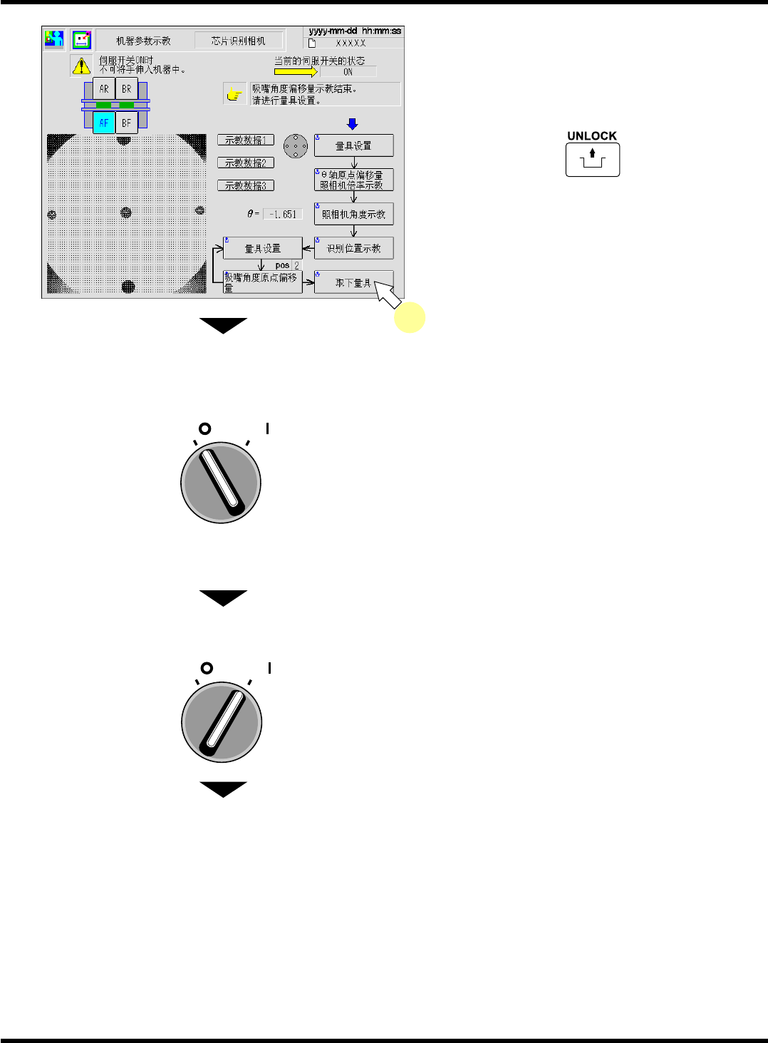 CM602-L 维修手册 2.2 机器参数的示教步 骤 Pa ge 2-71 27. 重复步骤 20. ~ 26. 的操作,进行示教。 ∗ 反复操作完了后, 请确认 “ 请取下量具。 ” 的信息 已出现,然后进行下一 步骤。 28. 按操作面板的 + [ 取下量具 ] 。 29. 将伺服开关置于 OFF (O) 。 30. 打开安全盖。 31. 取下量具,安装吸嘴座后将取下的量具安 装在原来的位置上。 32. 关闭安全盖。 33. 将伺…