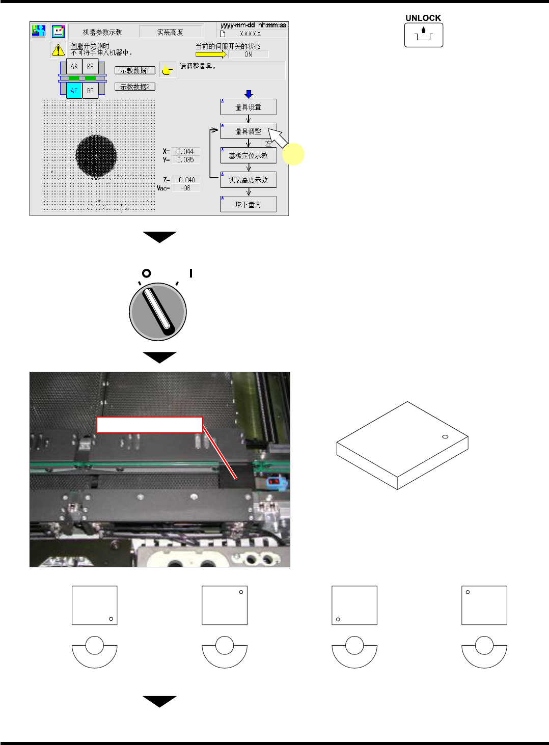 CM602-L 维修手册 2.2 机器参数的示教步 骤 Pa ge 2-85 17. 按操作面板的 + [ 量具调整 ] 。 • 吸头退避,第 1 实装位置的 基板止动器将处 于 ON 状态。 18. 将伺服开关置于 OFF (O) 。 19. 打开安全盖。 20. 将实装高度量具设置于第 1 实装位置上。 ∗ 请将量具孔设置于下图 位置上。 4Z4C-428E 4Z4C-429E 4Z4C-430E 4Z4C-431E 自左到右,前侧…
