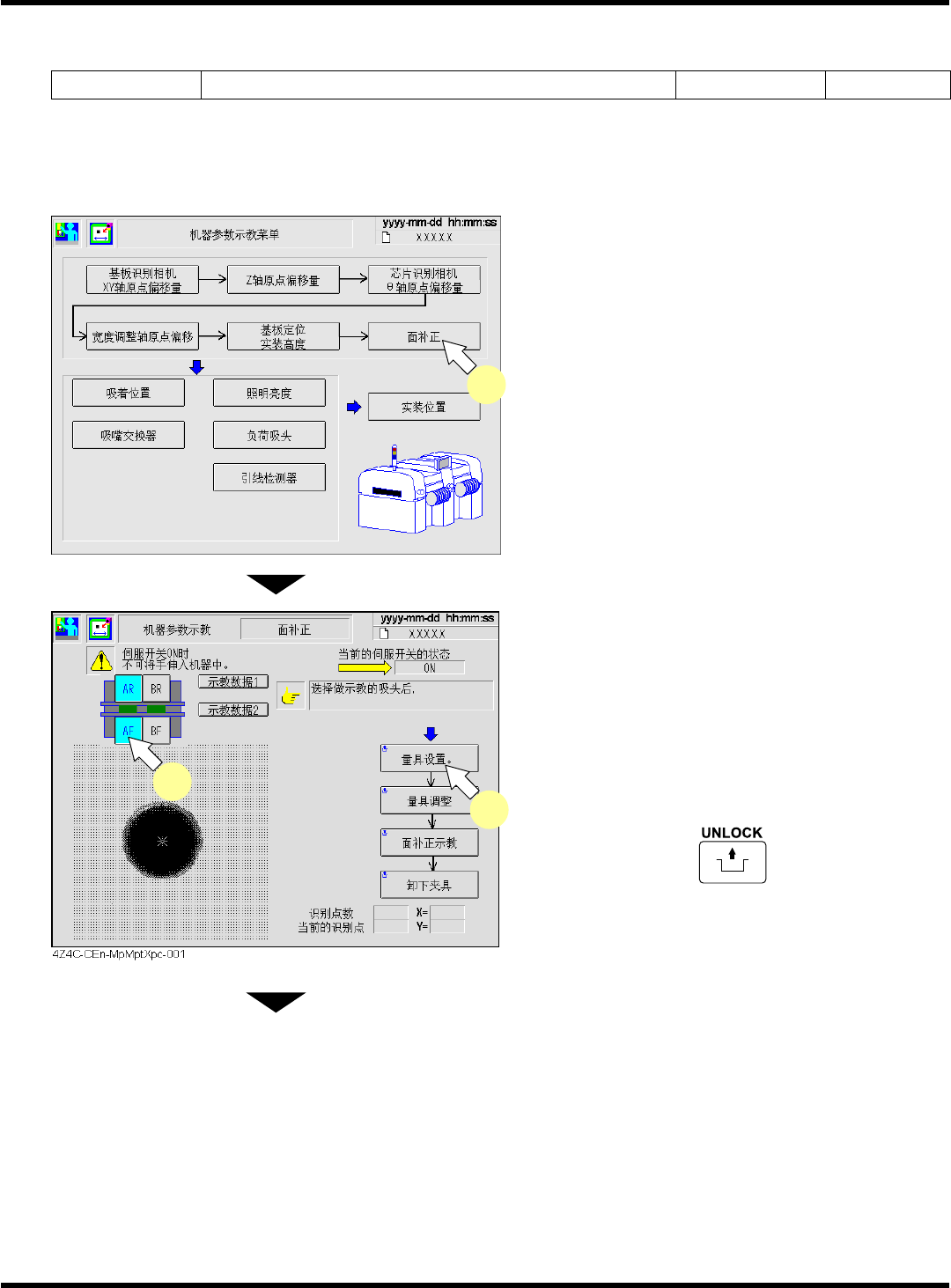 CM602-L 维修手册 2.2 机器参数的示教步 骤 Pa ge 2-88 31. 按功能键 。 32. 按操作面板的 + [ 执行 ] 。 • 吸头移向原点位置。 EJM8A- C-MMC02-A 02-01 EJM4A -Mp-0105 31 EJM4A -Mp-0106 32
