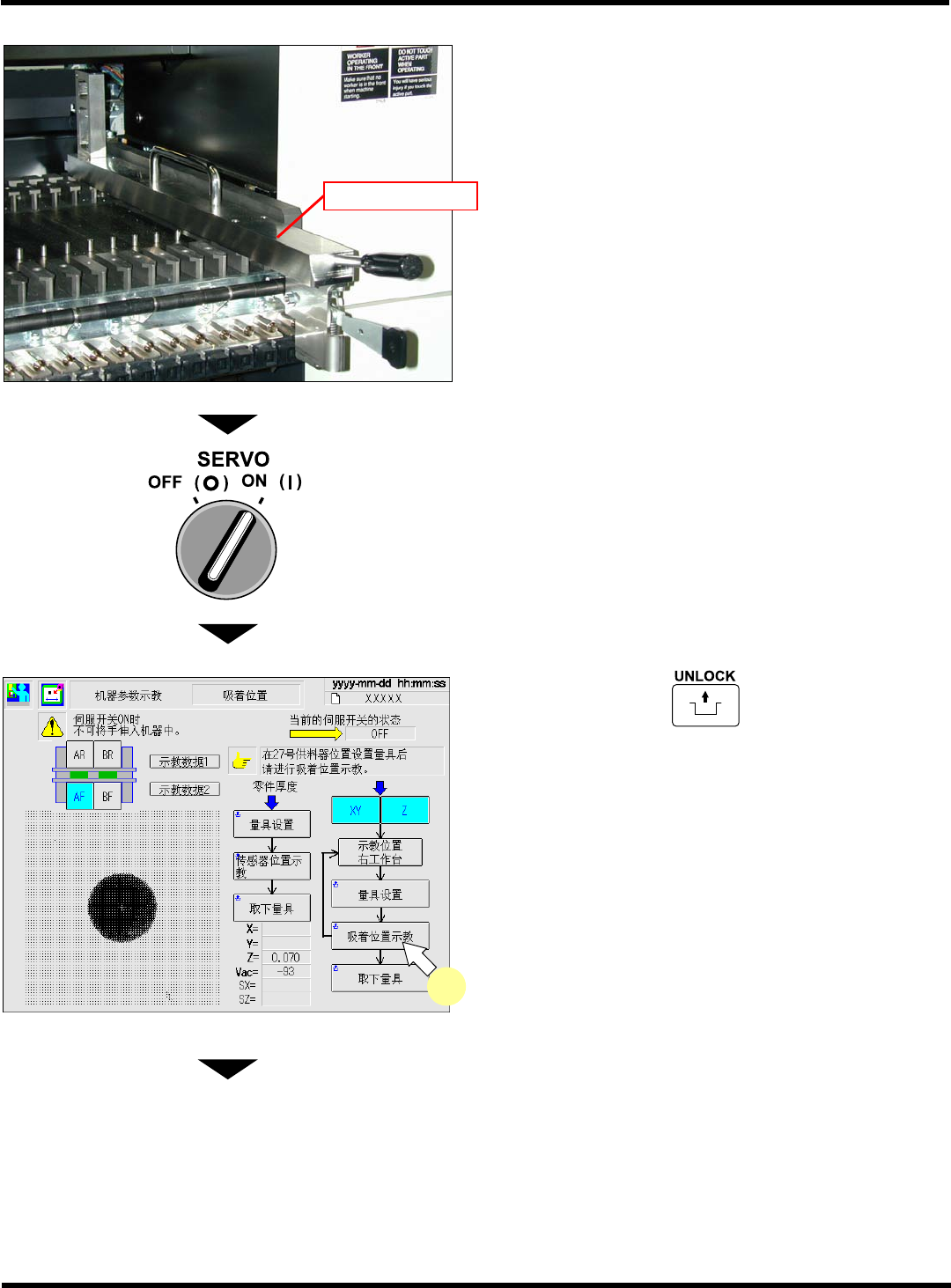 CM602-L 维修手册 2.2 机器参数的示教步 骤 Page 2-1 09 28. 按操作面板上的 + [ 量具取下 ] 。 29. 将伺服开关置于 OFF (O) 。 30. 打开安全盖。 31. 取下量具和吸嘴。 32. 关闭安全盖。 33. 将伺服开关置于 ON ( I ) 。 • 以后为部品厚度传感器 (8 吸嘴用选购件 ) 的 示教步骤。 34. 按操作面板上的 + [ 量具设置 ] 。 下一页 EJM8A- C-MMC0…